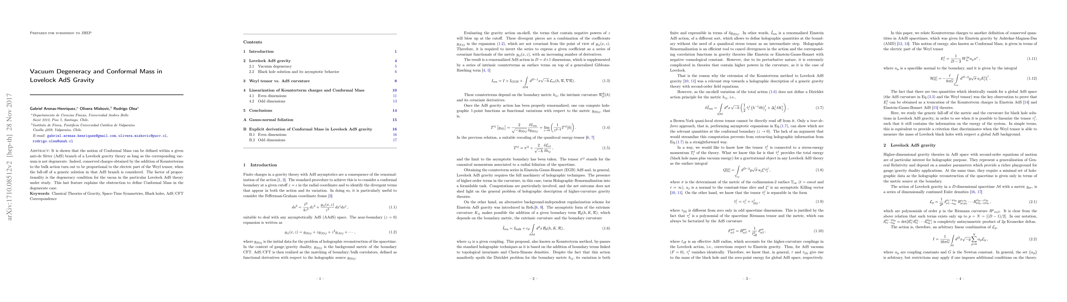 It is shown that the notion of Conformal Mass can be defined within a given anti-de Sitter (AdS) branch of a Lovelock gravity theory as long as the corresponding vacuum is not degenerate. Indeed, conserved charges obtained by the addition of Kounterterms to the bulk action turn out to be proportional to the electric part of the Weyl tensor, when the fall-off of a generic solution in that AdS branch is considered. The factor of proportionality is the degeneracy condition for the vacua in the particular Lovelock AdS theory under study. This last feature explains the obstruction to define Conformal Mass in the degenerate case.
