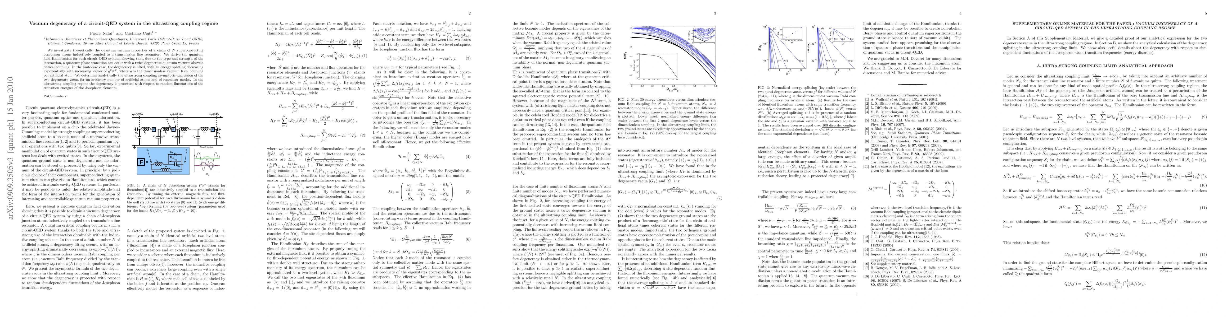 We investigate theoretically the quantum vacuum properties of a chain of $N$ superconducting Josephson atoms inductively coupled to a transmission line resonator. We derive the quantum field Hamiltonian for such circuit-QED system, showing that, due to the type and strength of the interaction, a quantum phase transition can occur with a twice degenerate quantum vacuum above a critical coupling. In the finite-size case, the degeneracy is lifted, with an energy splitting decreasing exponentially with increasing values of $g^2 N^2$, where $g$ is the dimensionless vacuum Rabi coupling per artificial atom. We determine analytically the ultrastrong coupling asymptotic expression of the two degenerate vacua for an arbitrary number of artificial atoms and of resonator modes. In the ultrastrong coupling regime the degeneracy is protected with respect to random fluctuations of the transition energies of the Josephson elements.