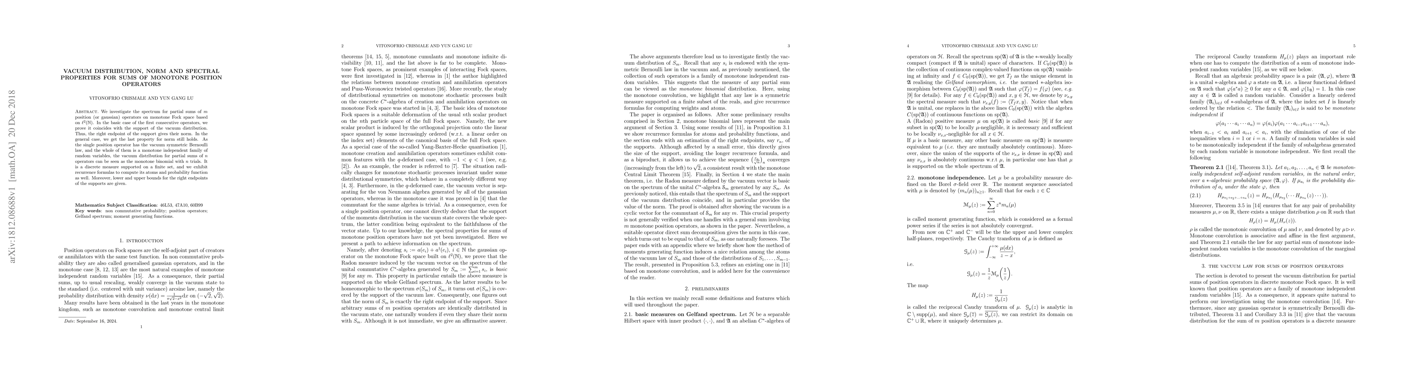 This paper studies the spectral properties of partial sums of monotone position operators on monotone Fock space, proving that the spectrum of the first consecutive operators coincides with the support of the vacuum distribution. It also shows that the norm of these operators is determined by the right endpoint of this support, and provides recurrence formulas for computing the vacuum distribution of the sums.