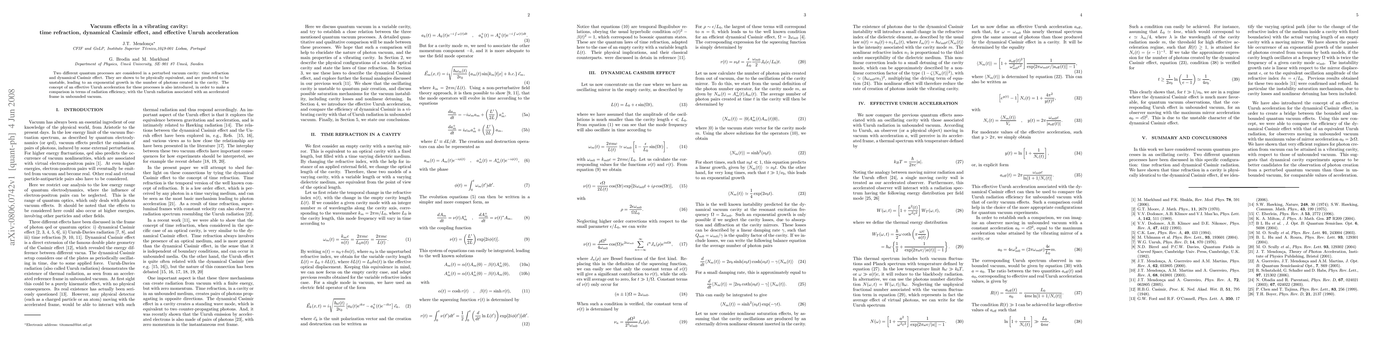 This paper explores quantum processes in a vibrating cavity, demonstrating the equivalence of time refraction and the dynamical Casimir effect, both showing instability and exponential photon growth. It introduces the concept of effective Unruh acceleration to compare radiation efficiency with Unruh radiation in an accelerated frame.