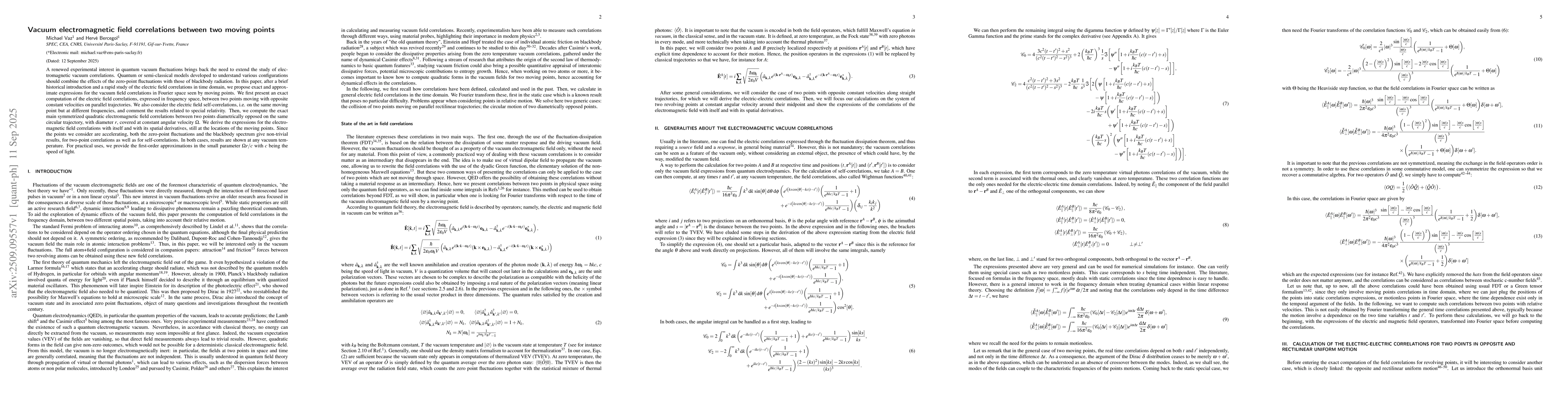 A renewed experimental interest in quantum vacuum fluctuations brings back the need to extend the study of electromagnetic vacuum correlations. Quantum or semi-classical models developed to understand various configurations should combine the effects of the zero-point fluctuations with those of blackbody radiation. In this paper, after a brief historical introduction and a rapid study of the electric field correlations in time domain, we propose exact and approximate expressions for the vacuum field correlations in Fourier space seen by moving points. We first present an exact computation of the electric field correlations, expressed in frequency space, between two points moving with opposite constant velocities on parallel trajectories. We also consider the electric field self-correlations, i.e. on the same moving point but at different frequencies, and comment the results related to special relativity. Then, we compute the exact main symmetrized quadratic electromagnetic field correlations between two points diametrically opposed on the same circular trajectory, with diameter r, covered at constant angular velocity {\Omega}. We derive the expressions for the electromagnetic field correlations with itself and with its spatial derivatives, still at the locations of the moving points. Since the points we consider are accelerating, both the zero-point fluctuations and the blackbody spectrum give non-trivial results, for two-point correlations as well as for self-correlations. In both cases, results are shown at any vacuum temperature. For practical uses, we provide the first-order approximations in the small parameter {\Omega}r/c with c being the speed of light.
