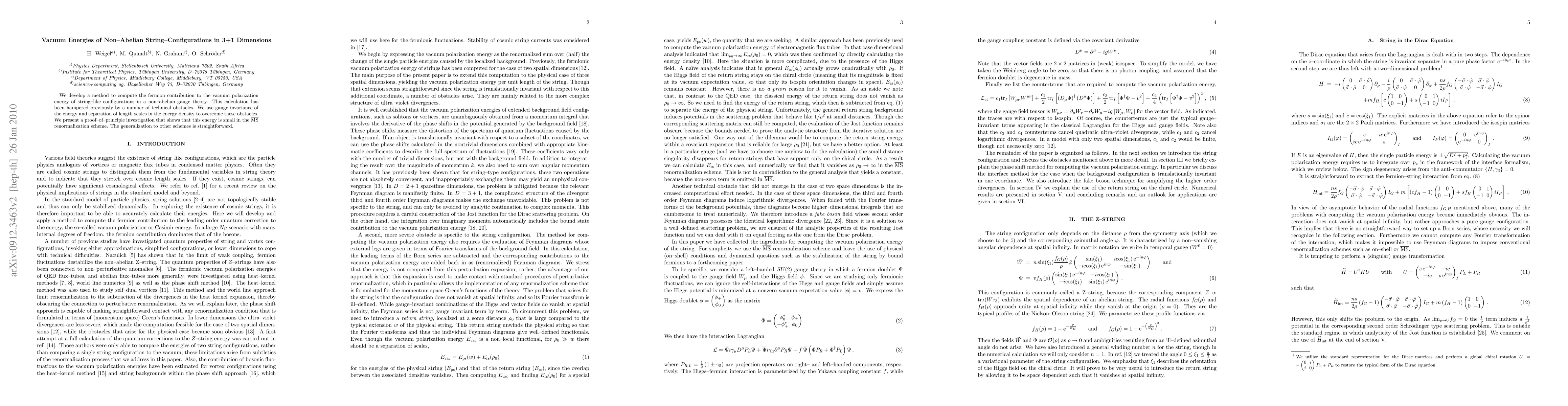 The paper introduces a novel method to compute fermion contributions to vacuum polarization energy of string-like configurations in non-Abelian gauge theories, overcoming previous technical obstacles. The method, based on gauge invariance and length scale separation, demonstrates the energy's smallness in the MS-bar renormalization scheme, with potential for generalization to other schemes.
