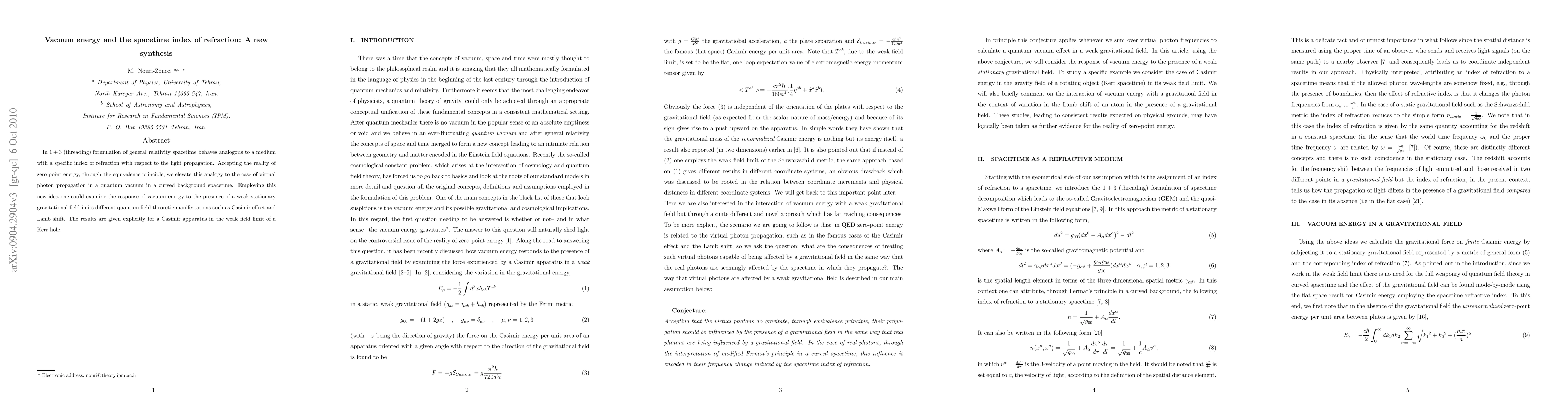 This paper explores the analogy between spacetime in general relativity and a medium with a refractive index, extending this to vacuum energy and quantum effects in curved spacetime. It specifically investigates the impact of a stationary gravitational field on vacuum energy, exemplified by the Casimir effect and Lamb shift in the weak field limit of a Kerr black hole.