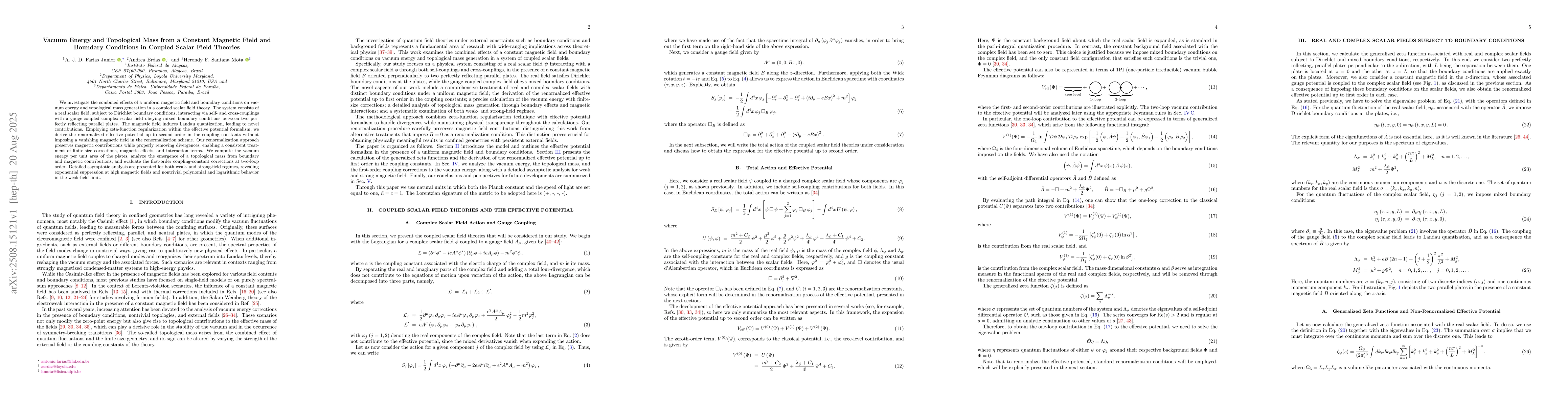 We investigate the combined effects of a uniform magnetic field and boundary conditions on vacuum energy and topological mass generation in a coupled scalar field theory. The system consists of a real scalar field, subject to Dirichlet boundary conditions, interacting via self- and cross-couplings with a gauge-coupled complex scalar field obeying mixed boundary conditions between two perfectly reflecting parallel plates. The magnetic field induces Landau quantization, leading to novel contributions. Employing zeta-function regularization within the effective potential formalism, we derive the renormalized effective potential up to second order in the coupling constants without imposing a vanishing magnetic field in the renormalization scheme. Our renormalization approach preserves magnetic contributions while properly removing divergences, enabling a consistent treatment of finite-size corrections, magnetic effects, and interaction terms. We compute the vacuum energy per unit area of the plates, analyze the emergence of a topological mass from boundary and magnetic contributions, and evaluate the first-order coupling-constant corrections at two-loop order. Detailed asymptotic analysis are presented for both weak- and strong-field regimes, revealing exponential suppression at high magnetic fields and nontrivial polynomial and logarithmic behavior in the weak-field limit.