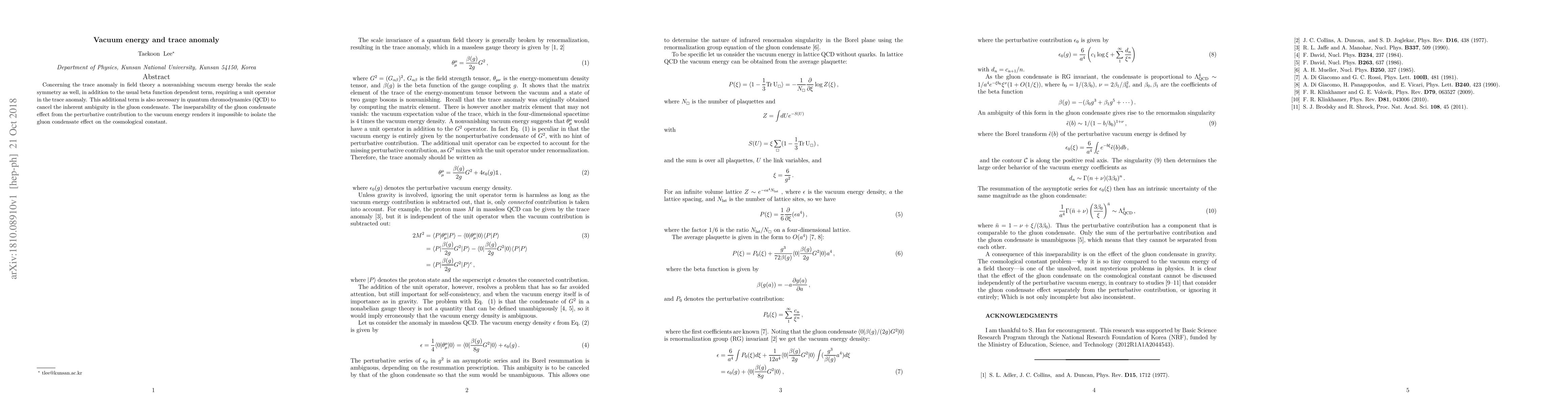 This paper discusses how a nonvanishing vacuum energy in field theory disrupts scale symmetry, necessitating a unit operator in the trace anomaly, which is crucial in quantum chromodynamics (QCD) to offset the inherent ambiguity in the gluon condensate. The inseparable nature of the gluon condensate from perturbative contributions complicates isolating its effects on the cosmological constant.