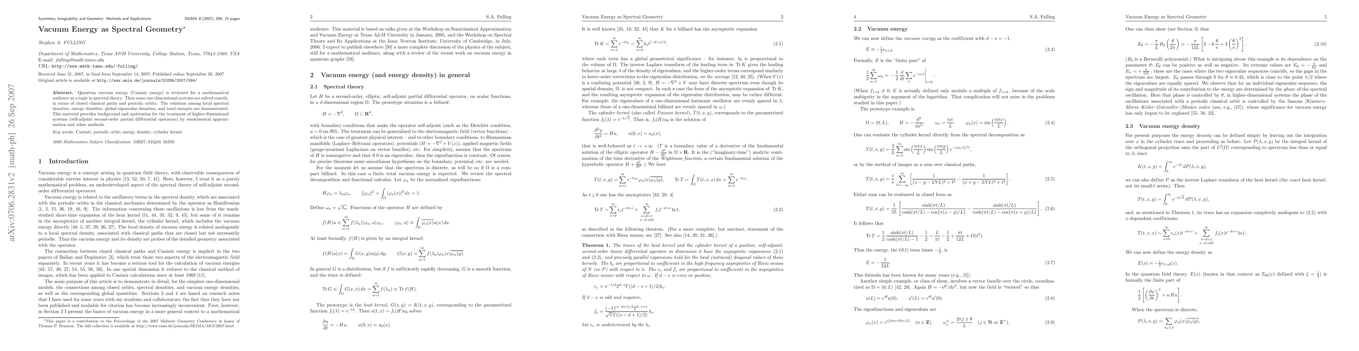 Quantum vacuum energy (Casimir energy) is reviewed for a mathematical audience as a topic in spectral theory. Then some one-dimensional systems are solved exactly, in terms of closed classical paths and periodic orbits. The relations among local spectral densities, energy densities, global eigenvalue densities, and total energies are demonstrated. This material provides background and motivation for the treatment of higher-dimensional systems (self-adjoint second-order partial differential operators) by semiclassical approximation and other methods.