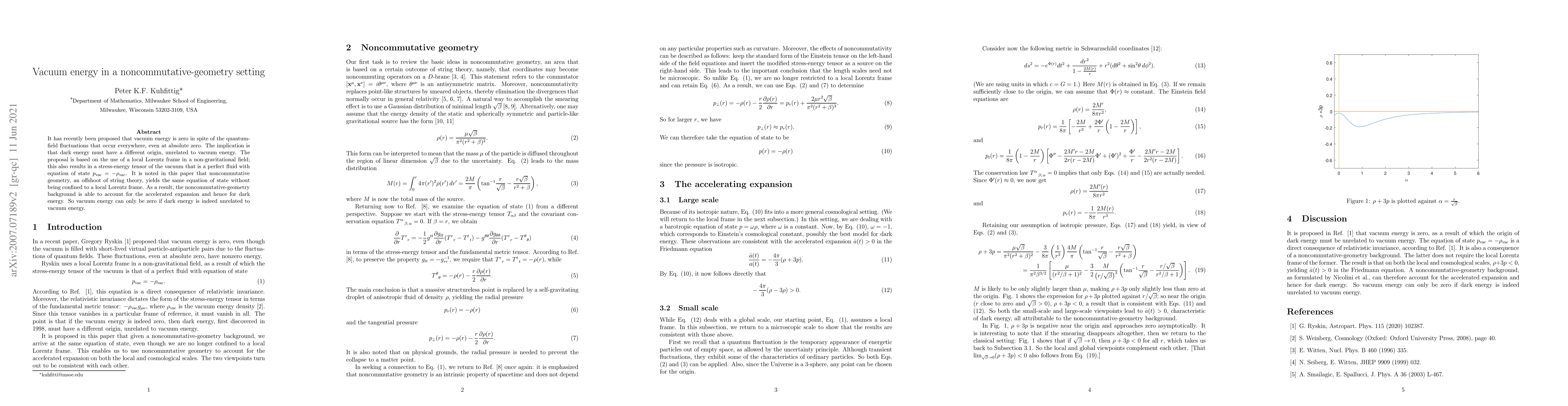 It has recently been proposed that vacuum energy is zero in spite of the quantum-field fluctuations that occur everywhere, even at absolute zero. The implication is that dark energy must have a different origin, unrelated to vacuum energy. It is proposed in this paper that noncommutative geometry, an offshoot of string theory, may provide such an origin due to its ability to account for the accelerated expansion.