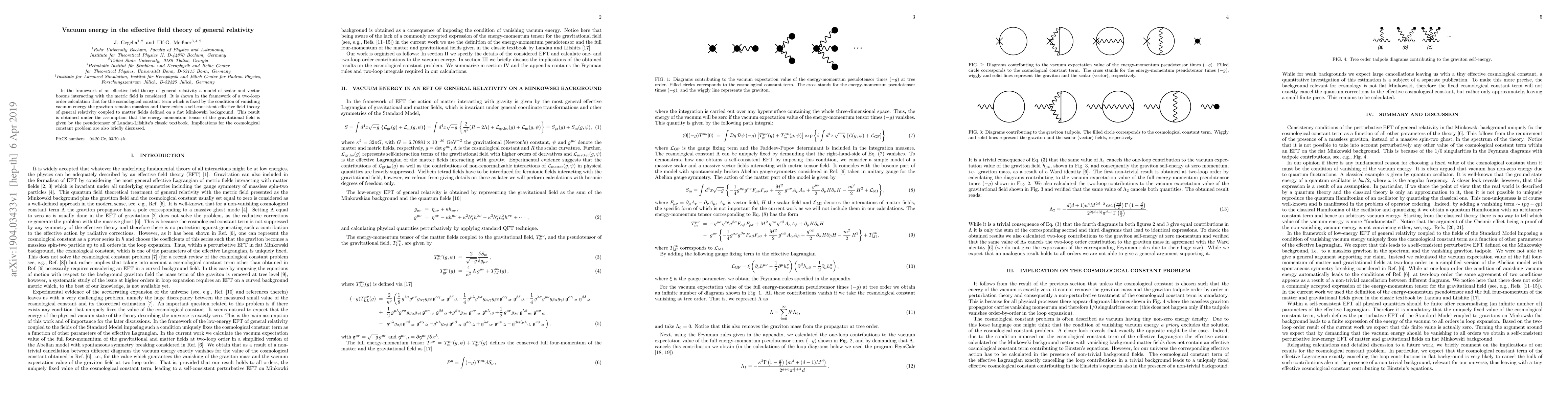 In the framework of an effective field theory of general relativity a model of scalar and vector bosons interacting with the metric field is considered. It is shown in the framework of a two-loop order calculation that for the cosmological constant term which is fixed by the condition of vanishing vacuum energy the graviton remains massless and there exists a self-consistent effective field theory of general relativity coupled to matter fields defined on a flat Minkowski background. This result is obtained under the assumption that the energy-momentum tensor of the gravitational field is given by the pseudotensor of Landau-Lifshitz's classic textbook. Implications for the cosmological constant problem are also briefly discussed.