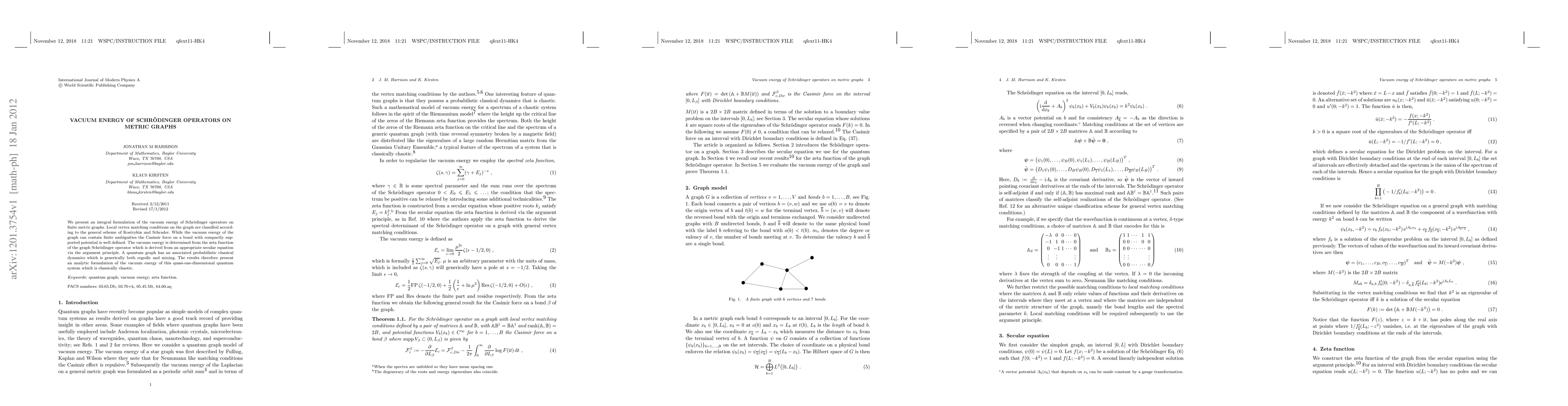 We present an integral formulation of the vacuum energy of Schr\"odinger operators on finite metric graphs. Local vertex matching conditions on the graph are classified according to the general scheme of Kostrykin and Schrader. While the vacuum energy of the graph can contain finite ambiguities the Casimir force on a bond with compactly supported potential is well defined. The vacuum energy is determined from the zeta function of the graph Schr\"odinger operator which is derived from an appropriate secular equation via the argument principle. A quantum graph has an associated probabilistic classical dynamics which is generically both ergodic and mixing. The results therefore present an analytic formulation of the vacuum energy of this quasi-one-dimensional quantum system which is classically chaotic.