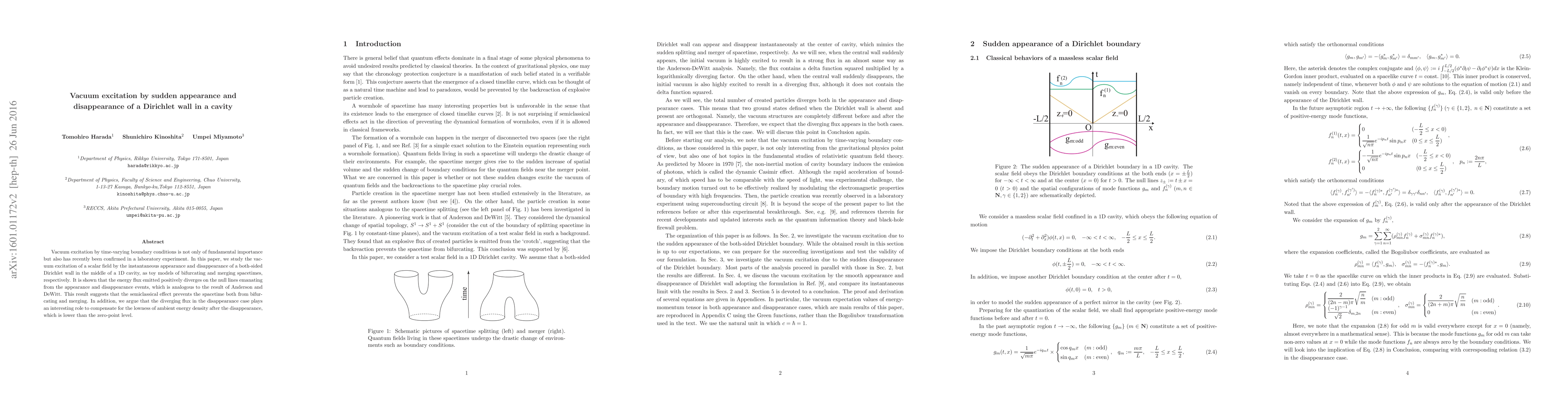 Vacuum excitation by time-varying boundary conditions is not only of fundamental importance but also has recently been confirmed in a laboratory experiment. In this paper, we study the vacuum excitation of a scalar field by the instantaneous appearance and disappearance of a both-sided Dirichlet wall in the middle of a 1D cavity, as toy models of bifurcating and merging spacetimes, respectively. It is shown that the energy flux emitted positively diverges on the null lines emanating from the appearance and disappearance events, which is analogous to the result of Anderson and DeWitt. This result suggests that the semiclassical effect prevents the spacetime both from bifurcating and merging. In addition, we argue that the diverging flux in the disappearance case plays an interesting role to compensate for the lowness of ambient energy density after the disappearance, which is lower than the zero-point level.