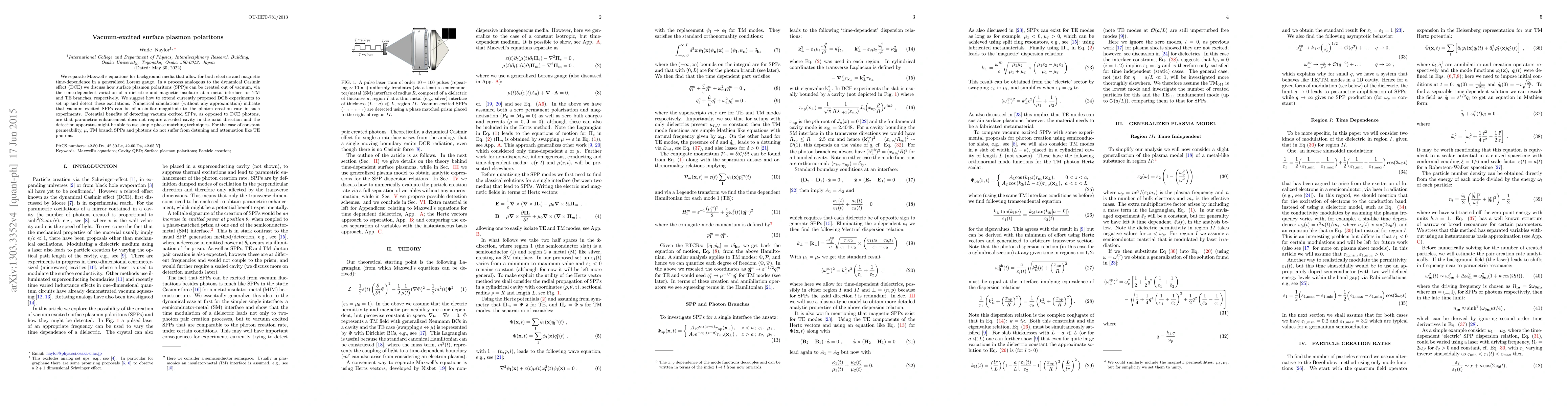 We separate Maxwell's equations for background media that allow for both electric and magnetic time-dependence in a generalized Lorenz gauge. In a process analogous to the dynamical Casimir effect (DCE) we discuss how surface plasmon polaritons (SPP)s can be created out of vacuum, via the time-dependent variation of a dielectric and magnetic insulator at a metal interface for TM and TE branches, respectively. We suggest how to extend currently proposed DCE experiments to set up and detect these excitations. Numerical simulations (without any approximation) indicate that vacuum excited SPPs can be of a similar magnitude to the photon creation rate in such experiments. Potential benefits of detecting vacuum excited SPPs, as opposed to DCE photons, are that parametric enhancement does not require a sealed cavity in the axial direction and the detection apparatus might be able to use simple phase matching techniques. For the case of constant permeability, $\mu$, TM branch SPPs and photons do not suffer from detuning and attenuation like TE photons.