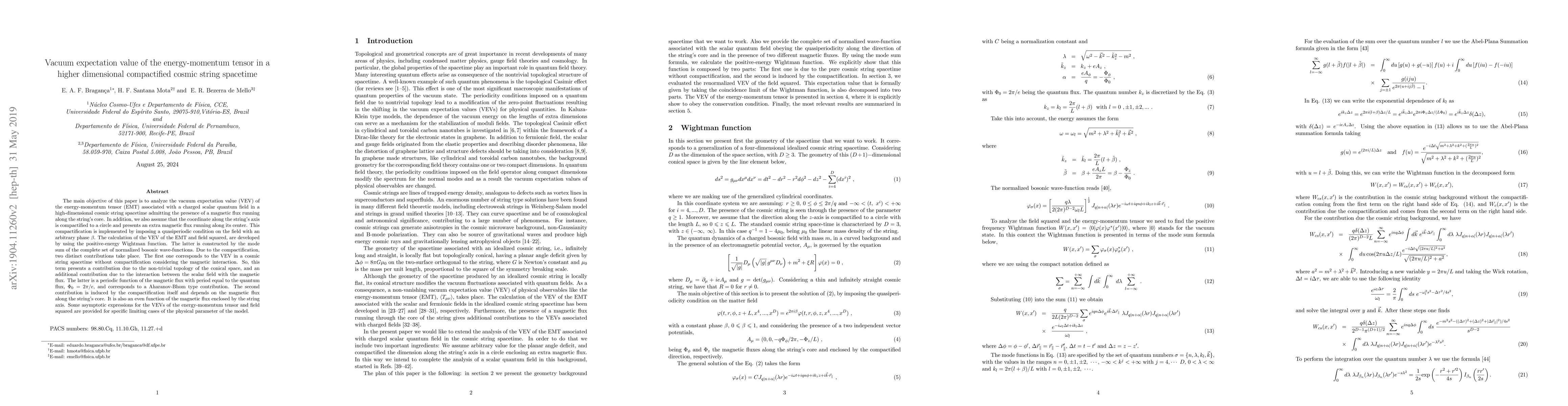This paper investigates the vacuum expectation value (VEV) of the energy-momentum tensor for a charged scalar field in a higher-dimensional cosmic string spacetime with magnetic flux. It considers compactification along the string's axis and derives contributions from both the cosmic string topology and the magnetic flux interaction.