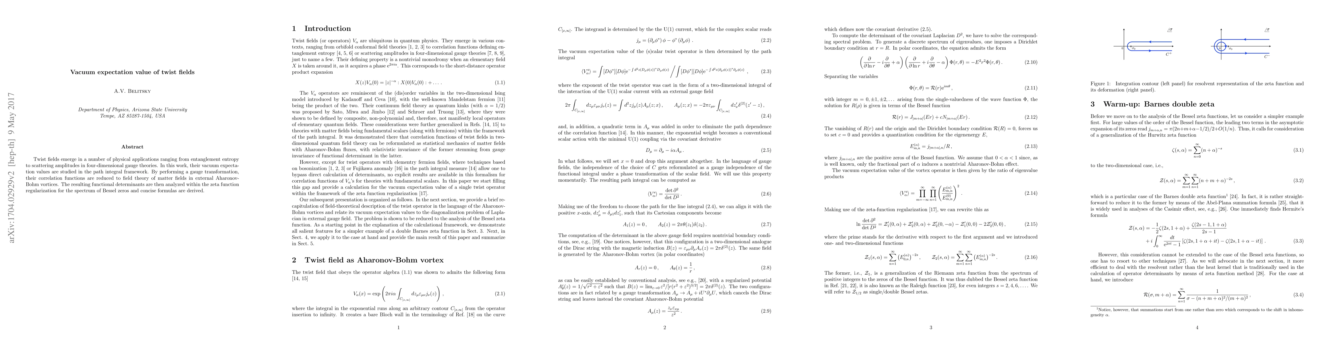 Twist fields emerge in a number of physical applications ranging from entanglement entropy to scattering amplitudes in four-dimensional gauge theories. In this work, their vacuum expectation values are studied in the path integral framework. By performing a gauge transformation, their correlation functions are reduced to field theory of matter fields in external Aharonov-Bohm vortices. The resulting functional determinants are then analyzed within the zeta function regularization for the spectrum of Bessel zeros and concise formulas are derived.