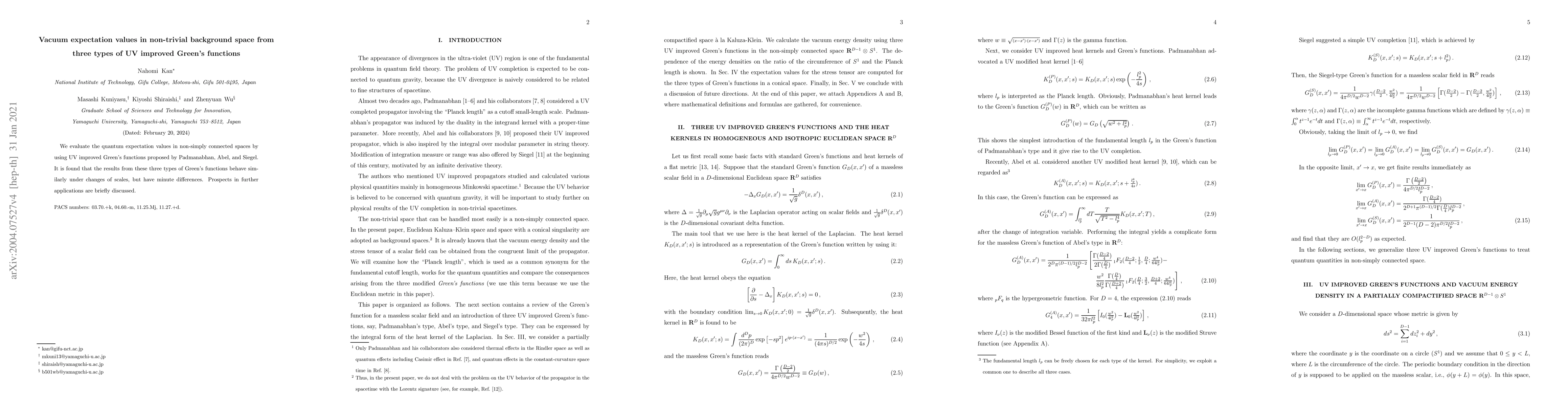 We evaluate the quantum expectation values in non-simply connected spaces by using UV improved Green's functions proposed by Padmanabhan, Abel, and Siegel. It is found that the results from these three types of Green's functions behave similarly under changes of scales, but have minute differences. Prospects in further applications are briefly discussed.