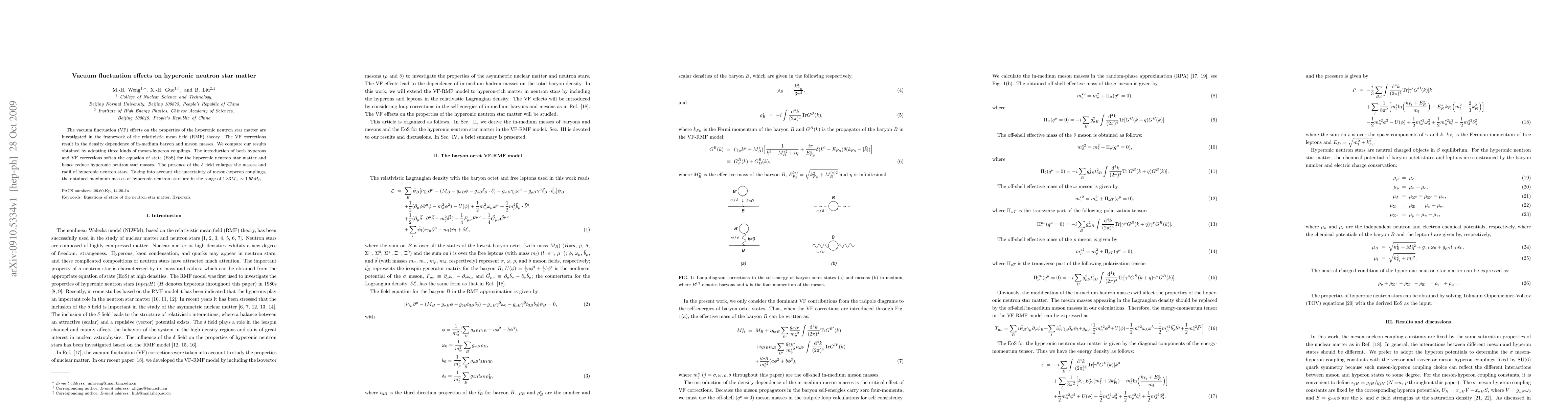 This paper investigates vacuum fluctuation effects on hyperonic neutron star matter using relativistic mean field theory, finding that VF corrections soften the equation of state and reduce neutron star masses. The study considers various meson-hyperon couplings, resulting in maximum neutron star masses ranging from $1.33M_{\odot}$ to $1.55M_{\odot}$.