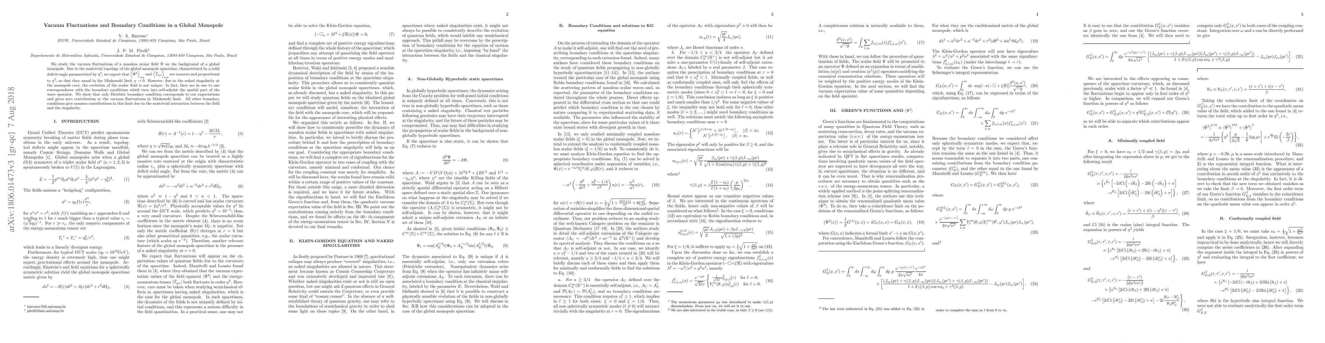 We study the vacuum fluctuations of a massless scalar field $\hat{\Psi}$ on the background of a global monopole. Due to the nontrivial topology of the global monopole spacetime, characterized by a solid deficit angle parametrized by $\eta^2$, we expect that $\left<\hat{\Psi}^2\right>_{\text{ren}}$ and $\left<\hat{T}_{\mu\nu}\right>_{\text{ren}}$ are nonzero and proportional to $\eta^2$, so that they annul in the Minkowski limit $\eta\to0$. However, due to the naked singularity at the monopole core, the evolution of the scalar field is not unique. In fact, they are in one to one correspondence with the boundary conditions which turn into self-adjoint the spatial part of the wave operator. We show that only Dirichlet boundary condition corresponds to our expectations and gives zero contribution to the vacuum fluctuations in Minkowski limit. All other boundary conditions give nonzero contributions in this limit due to the nontrivial interaction between the field and the singularity.