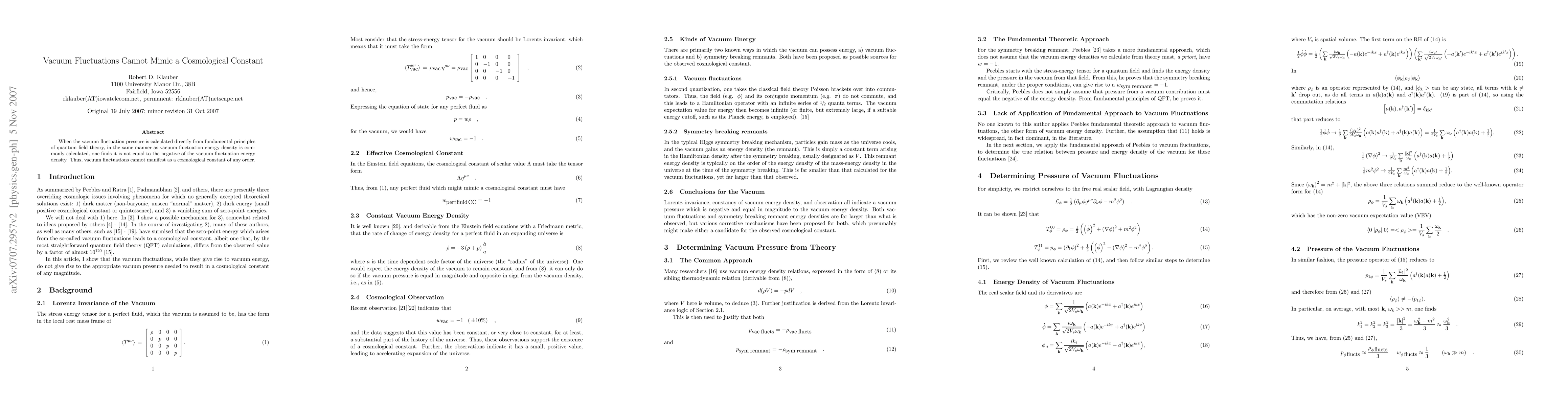 Summary: This paper demonstrates that vacuum fluctuation pressure, derived from quantum field theory, does not equate to the negative of vacuum fluctuation energy density, thereby proving that vacuum fluctuations cannot act as a cosmological constant.