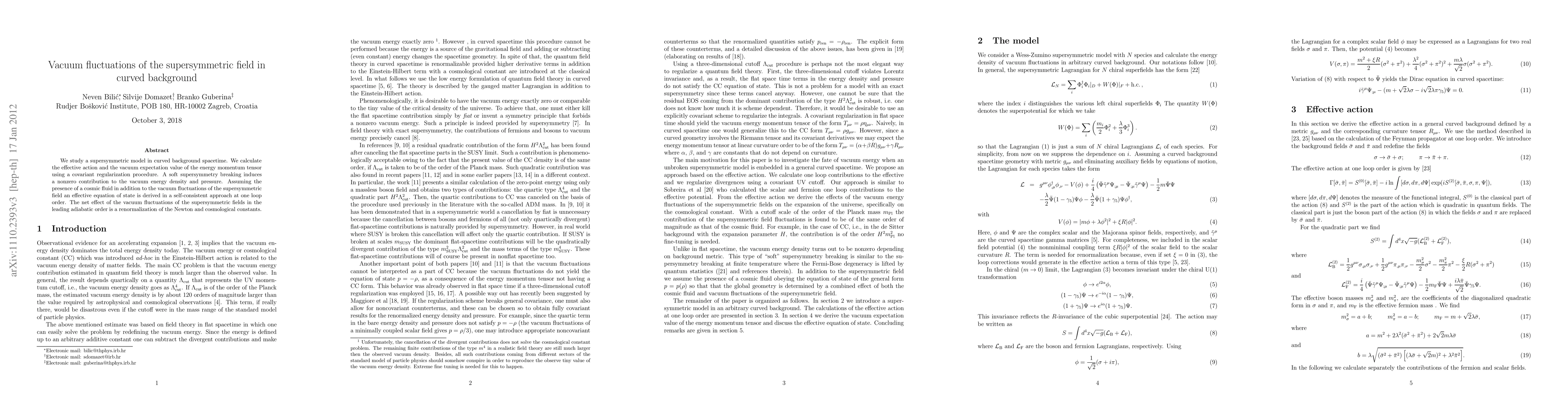 We study a supersymmetric model in curved background spacetime. We calculate the effective action and the vacuum expectation value of the energy momentum tensor using a covariant regularization procedure. A soft supersymmetry breaking induces a nonzero contribution to the vacuum energy density and pressure. Assuming the presence of a cosmic fluid in addition to the vacuum fluctuations of the supersymmetric field an effective equation of state is derived in a self-consistent approach at one loop order. The net effect of the vacuum fluctuations of the supersymmetric fields in the leading adiabatic order is a renormalization of the Newton and cosmological constants.