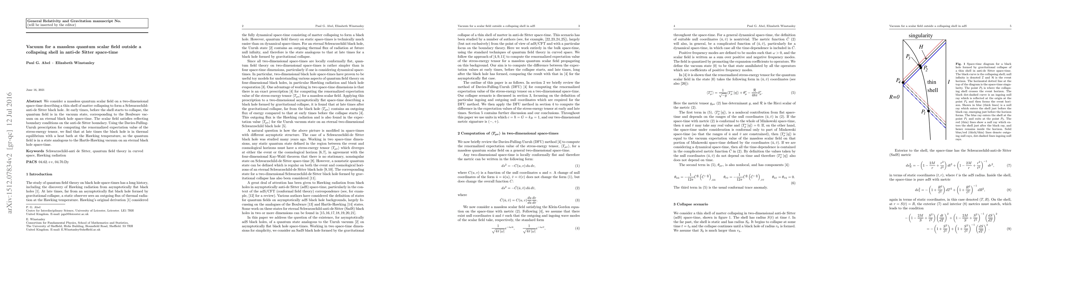 This paper examines a massless quantum scalar field in a two-dimensional space-time with an anti-de Sitter boundary, focusing on a collapsing shell forming a Schwarzschild-anti-de Sitter black hole. Initially in Boulware vacuum, the field transitions to a state analogous to the Hartle-Hawking vacuum, maintaining thermal equilibrium at the Hawking temperature.