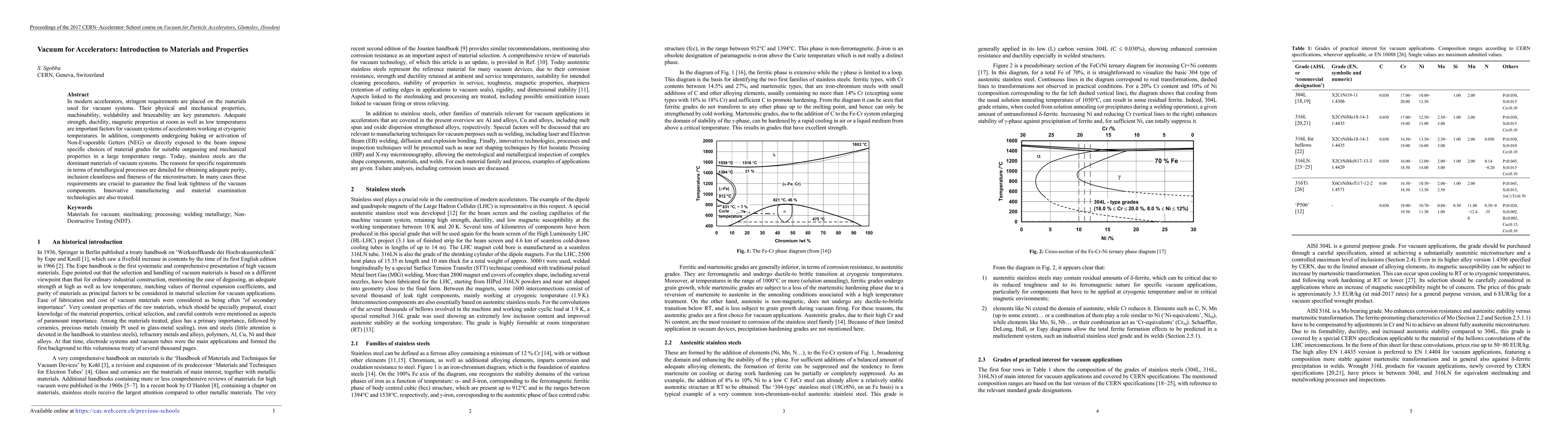 This paper discusses the critical materials and properties required for vacuum systems in modern accelerators, emphasizing the importance of physical, mechanical, and metallurgical characteristics such as strength, ductility, and magnetic properties. Stainless steels are highlighted as the primary material due to their suitability for stringent requirements, including purity, cleanliness, and microstructure fineness, which are essential for leak tightness and performance.