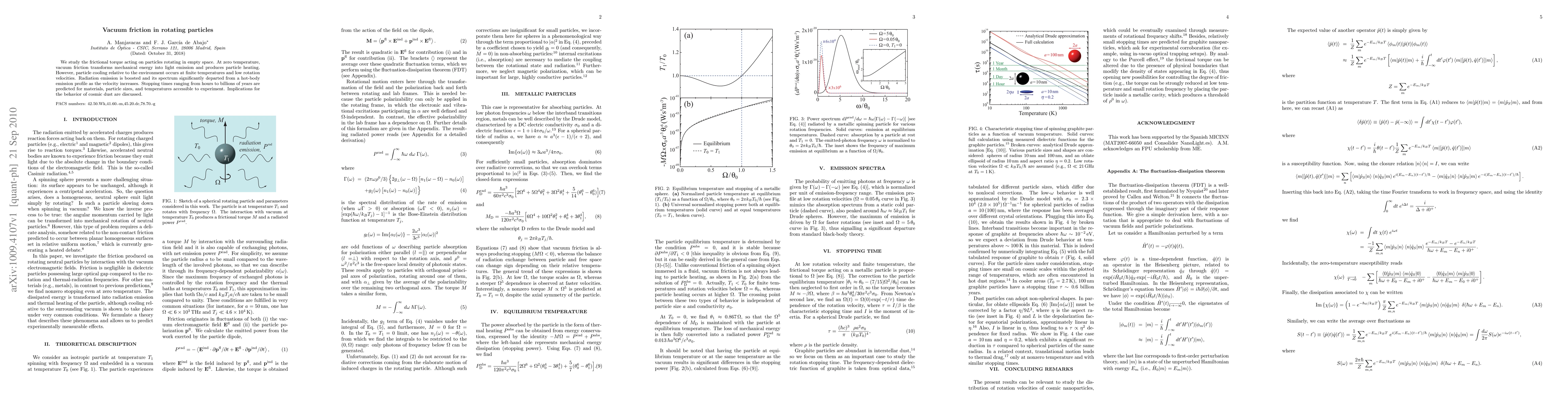 We study the frictional torque acting on particles rotating in empty space. At zero temperature, vacuum friction transforms mechanical energy into light emission and produces particle heating. However, particle cooling relative to the environment occurs at finite temperatures and low rotation velocities. Radiation emission is boosted and its spectrum significantly departed from a hot-body emission profile as the velocity increases. Stopping times ranging from hours to billions of years are predicted for materials, particle sizes, and temperatures accessible to experiment. Implications for the behavior of cosmic dust are discussed.