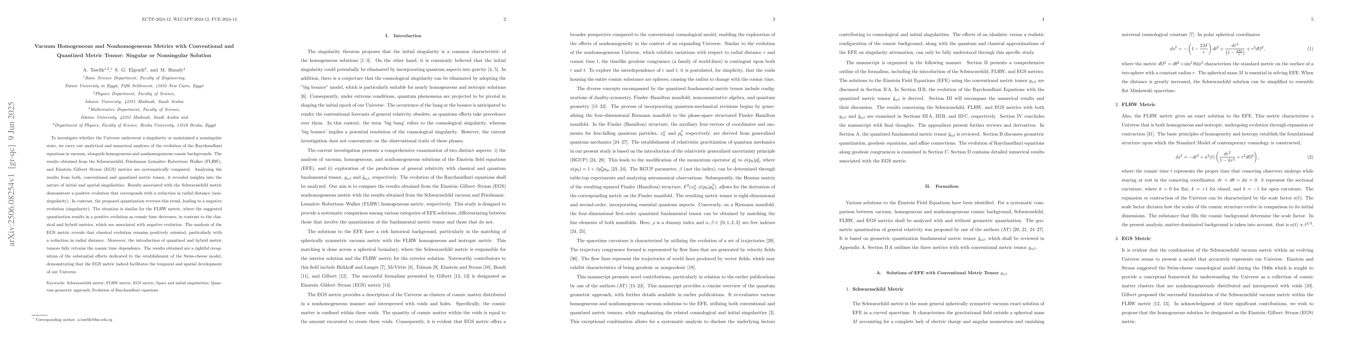 This research examines vacuum metrics for homogeneous and nonhomogeneous cosmic backgrounds, comparing Schwarzschild, FLRW, and EGS metrics. Findings indicate that conventional metrics suggest a singularity, while quantized metrics propose nonsingular evolution. The Einstein-Gilbert-Straus (EGS) metric supports positive temporal and spatial development, validating the Swiss-cheese model.