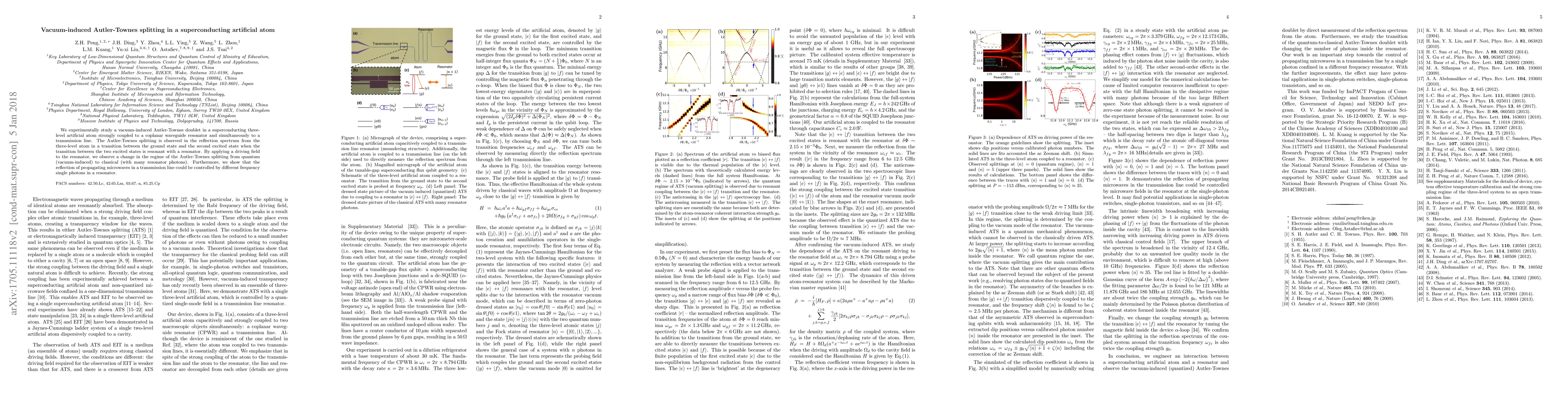 Summary: Researchers observe vacuum-induced Autler-Townes splitting in a superconducting artificial atom coupled to a resonator and transmission line, demonstrating control from quantum to classical splitting regimes, and showcasing microwave reflection control by single photons.