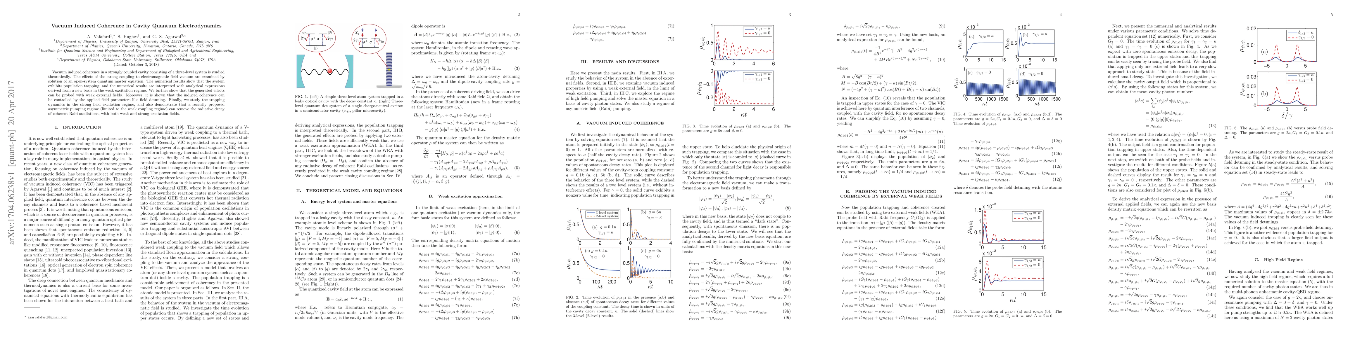 Researchers studied vacuum-induced coherence in a strongly coupled cavity system, finding it can exhibit population trapping and control via applied field parameters like detuning, with implications for quantum information processing and manipulation of coherent Rabi oscillations.