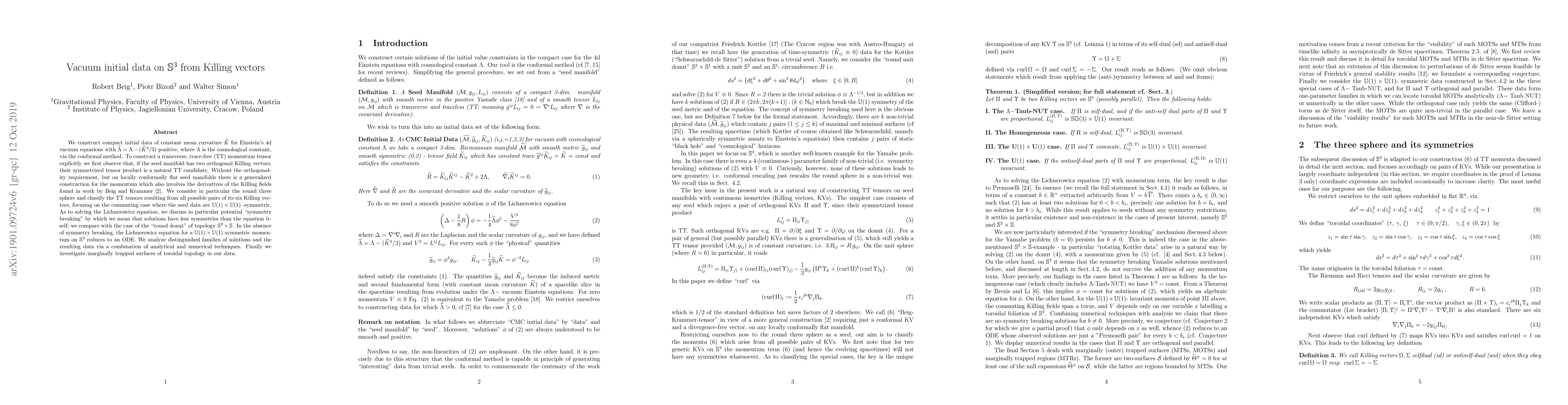 We construct compact initial data of constant mean curvature $\widetilde{K}$ for Einstein's 4d vacuum equations with $\widehat{\Lambda} = \Lambda - (\widetilde{K}^2/3)$ positive, where $\Lambda$ is the cosmological constant, via the conformal method. To construct a transverse, trace-free (TT) momentum tensor explicitly we first observe that, if the seed manifold has two orthogonal Killing vectors, their symmetrized tensor product is a natural TT candidate. Without the orthogonality requirement, but on locally conformally flat seed manifolds there is a generalized construction for the momentum which also involves the derivatives of the Killing fields found in work by Beig and Krammer [2]. We consider in particular the round three sphere and classify the TT tensors resulting from all possible pairs of its six Killing vectors, focusing on the commuting case where the seed data are $\mathbb{U}(1) \times \mathbb{U}(1)$ -symmetric. As to solving the Lichnerowicz equation, we discuss in particular potential "symmetry breaking" by which we mean that solutions have less symmetries than the equation itself; we compare with the case of the "round donut" of topology $\mathbb{S}^2 \times \mathbb{S}$. In the absence of symmetry breaking, the Lichnerowicz equation for a $\mathbb{U}(1) \times \mathbb{U}(1)$ symmetric momentum on $\mathbb{S}^3$ reduces to an ODE. We analyze distinguished families of solutions and the resulting data via a combination of analytical and numerical techniques. Finally we investigate marginally trapped surfaces of toroidal topology in our data.