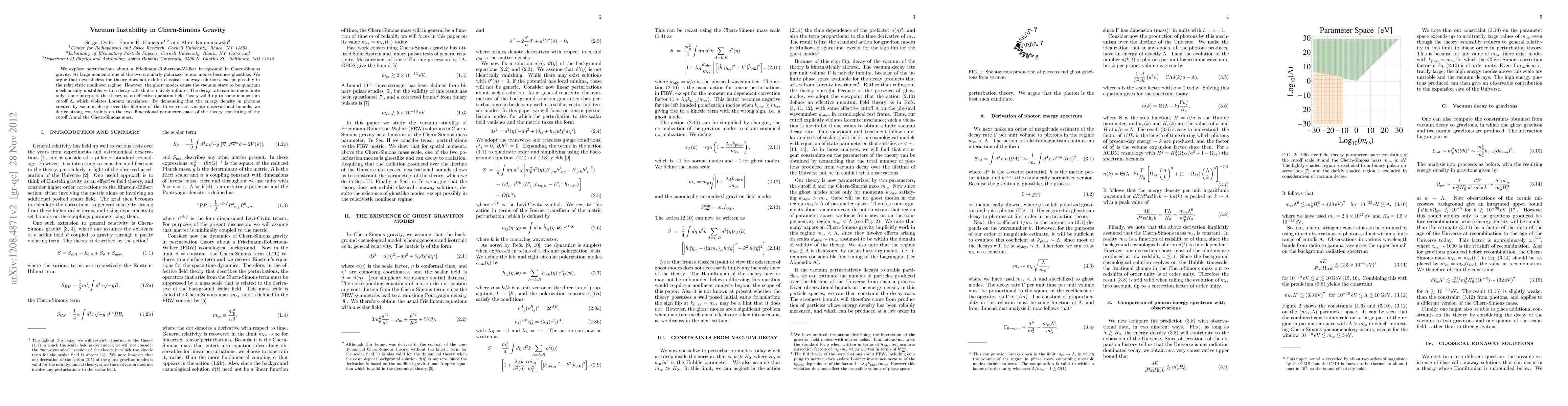 We explore perturbations about a Friedmann-Robertson-Walker background in Chern-Simons gravity. At large momenta one of the two circularly polarized tensor modes becomes ghostlike. We argue that nevertheless the theory does not exhibit classical runaway solutions, except possibly in the relativistic nonlinear regime. However, the ghost modes cause the vacuum state to be quantum mechanically unstable, with a decay rate that is naively infinite. The decay rate can be made finite only if one interprets the theory as an effective quantum field theory valid up to some momentum cutoff, which violates Lorentz invariance. By demanding that the energy density in photons created by vacuum decay over the lifetime of the Universe not violate observational bounds, we derive strong constraints on the two dimensional parameter space of the theory, consisting of the cutoff and the Chern-Simons mass.