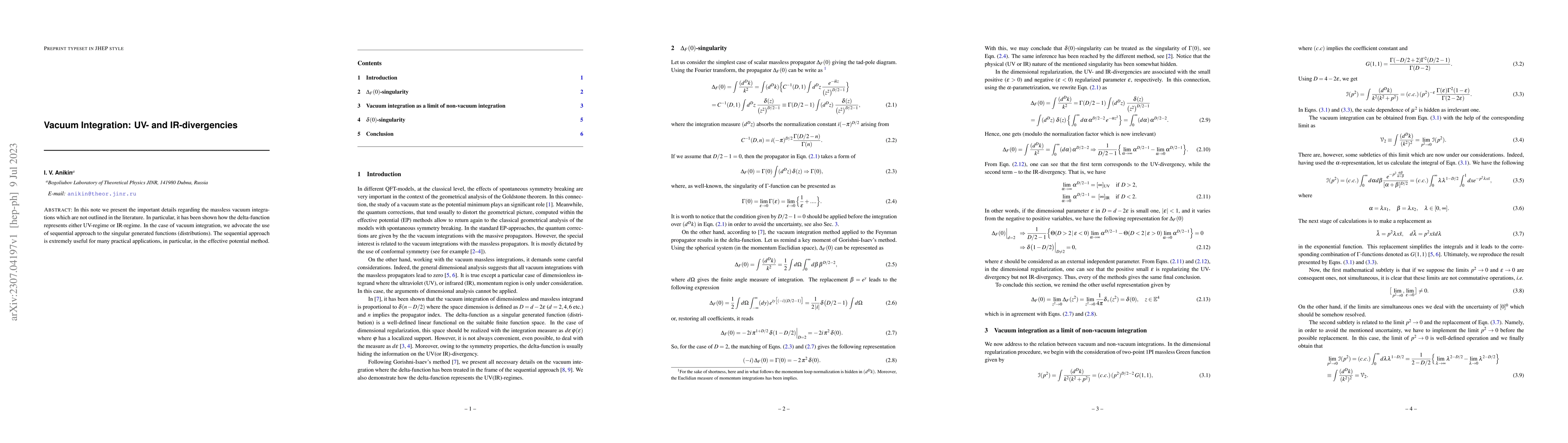 This paper discusses the integration of massless vacuum functions in quantum field theory, highlighting the role of delta-functions in representing ultraviolet (UV) and infrared (IR) regimes. It proposes a sequential approach to handle singular generated functions, which is particularly beneficial for practical applications like the effective potential method.