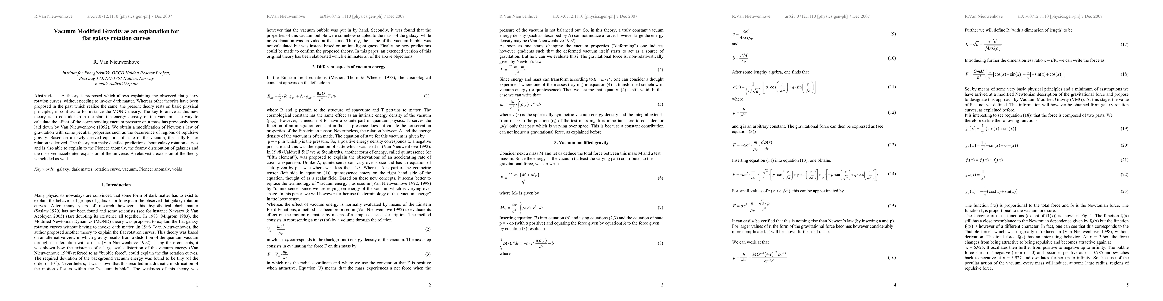 A theory is proposed which allows explaining the observed flat galaxy rotation curves, without needing to invoke dark matter. Whereas other theories have been proposed in the past which realize the same, the present theory rests on basic physical principles, in contrast to for instance the MOND theory. The key to arrive at this new theory is to consider from the start the energy density of the vacuum. The way to calculate the effect of the corresponding vacuum pressure on a mass has previously been laid down by Van Nieuwenhove (1992). We obtain a modification of Newton's law of gravitation with some peculiar properties such as the occurrence of regions of repulsive gravity. Based on a newly derived equation of state of the vacuum, the Tully-Fisher relation is derived. The theory can make detailed predictions about galaxy rotation curves and is also able to explain to the Pioneer anomaly, the foamy distribution of galaxies and the observed accelerated expansion of the universe. A relativistic extension of the theory is included as well.