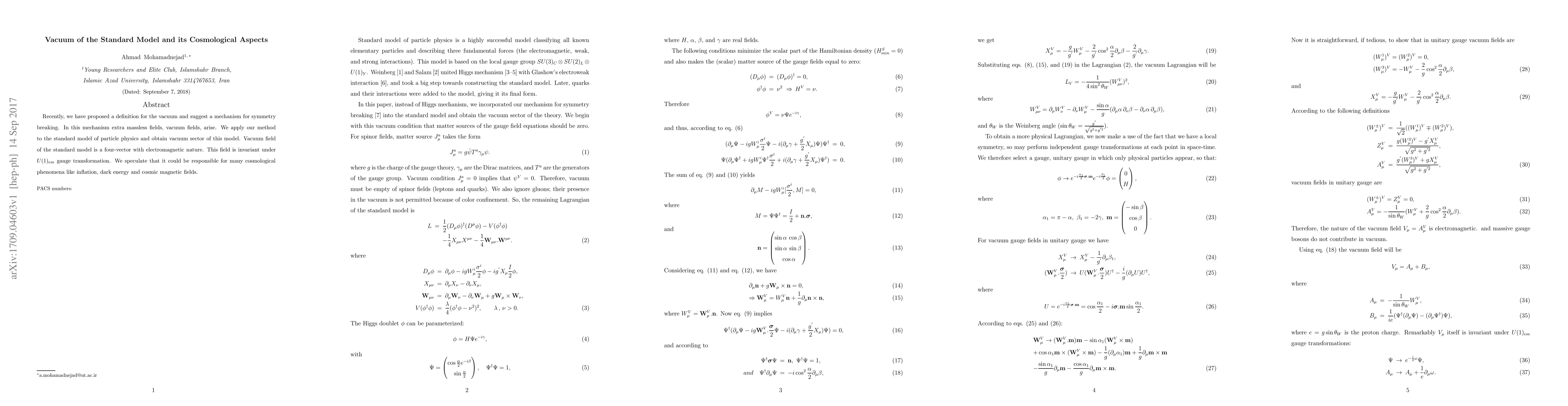 Recently, we have proposed a definition for the vacuum and suggest a mechanism for symmetry breaking. In this mechanism extra massless fields, vacuum fields, arise. We apply our method to the standard model of particle physics and obtain vacuum sector of this model. Vacuum field of the standard model is a four-vector with electromagnetic nature. This field is invariant under $ U(1)_{em} $ gauge transformation. We speculate that it could be responsible for many cosmological phenomena like inflation, dark energy and cosmic magnetic fields.