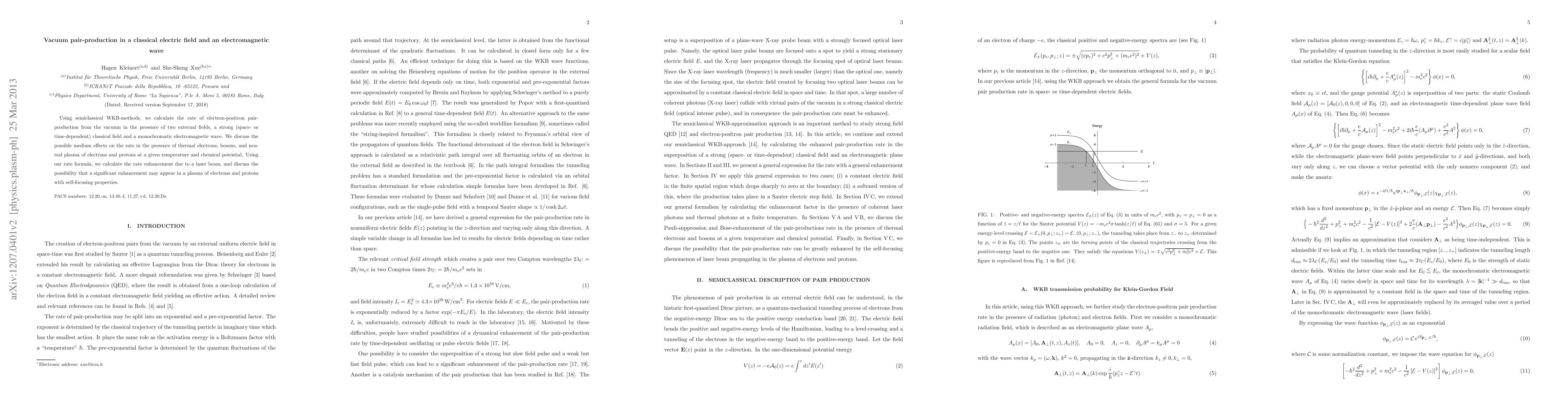 Using semiclassical WKB-methods, we calculate the rate of electron-positron pair-production from the vacuum in the presence of two external fields, a strong (space- or time-dependent) classical field and a monochromatic electromagnetic wave. We discuss the possible medium effects on the rate in the presence of thermal electrons, bosons, and neutral plasma of electrons and protons at a given temperature and chemical potential. Using our rate formula, we calculate the rate enhancement due to a laser beam, and discuss the possibility that a significant enhancement may appear in a plasma of electrons and protons with self-focusing properties.