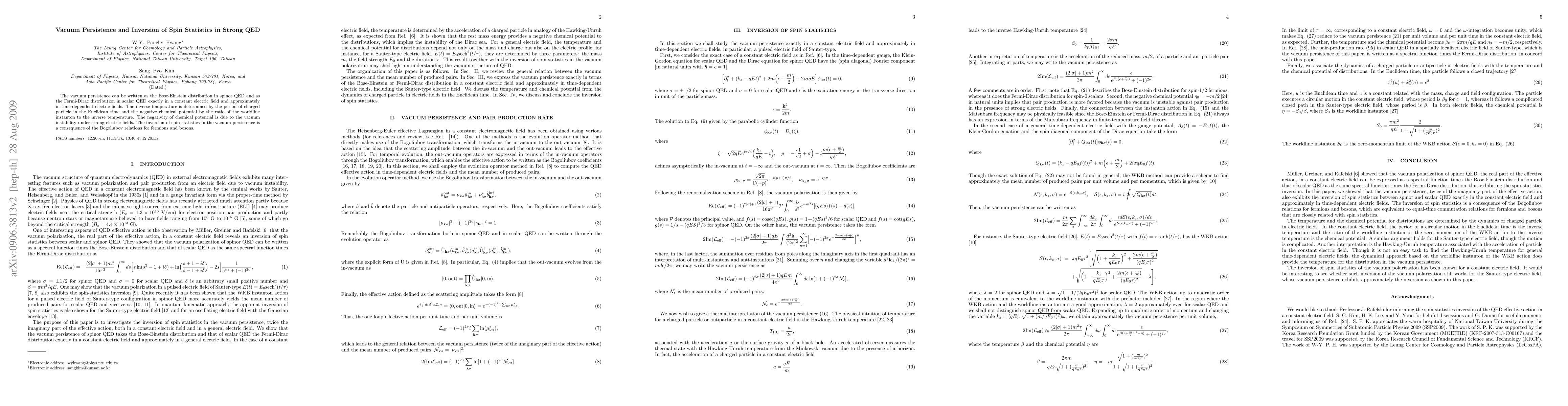 This paper explores vacuum persistence in quantum electrodynamics (QED) under strong electric fields, showing that it can be described by Bose-Einstein statistics in spinor QED and Fermi-Dirac statistics in scalar QED. The inversion of spin statistics is linked to the Bogoliubov relations and vacuum instability due to a negative chemical potential.