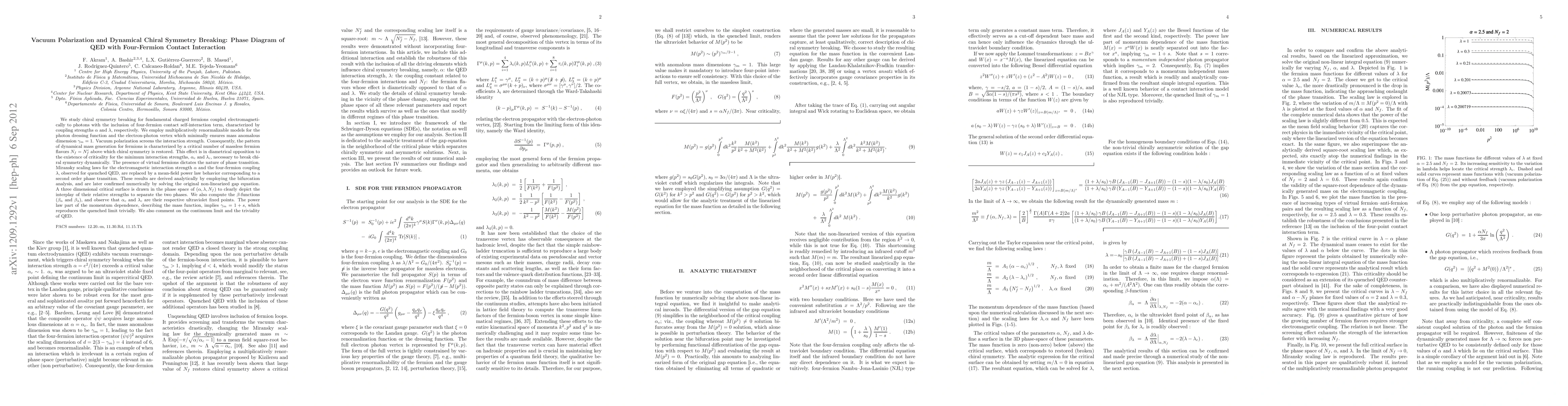 Researchers study how chiral symmetry breaks in QED with four-fermion contact interaction, finding a critical number of massless fermion flavors needed to restore symmetry, with a second-order phase transition at the boundary.