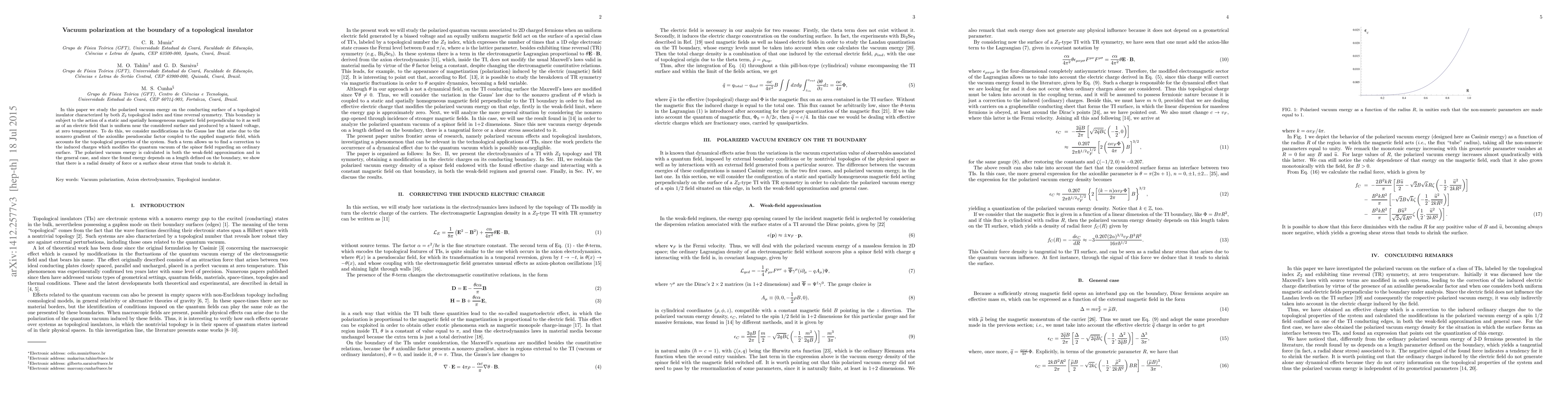In this paper we study the polarized vacuum energy on the conducting surface of a topological insulator characterized by both $Z_2$ topological index and time reversal symmetry. This boundary is subject to the action of a static and spatially homogeneous magnetic field perpendicular to it as well as of an electric field that is uniform near the considered surface and produced by a biased voltage, at zero temperature. To do this, we consider modifications in the Gauss law that arise due to the nonzero gradient of the axionlike pseudoscalar factor coupled to the applied magnetic field, which accounts for the topological properties of the system. Such a term allows us to find a correction to the induced charges which modifies the quantum vacuum of the spinor field regarding an ordinary surface. The polarized vacuum energy is calculated in both the weak-field approximation and in the general case, and since the found energy depends on a length defined on the boundary, we show that there is a radial density of force or a surface shear stress that tends to shrink it.