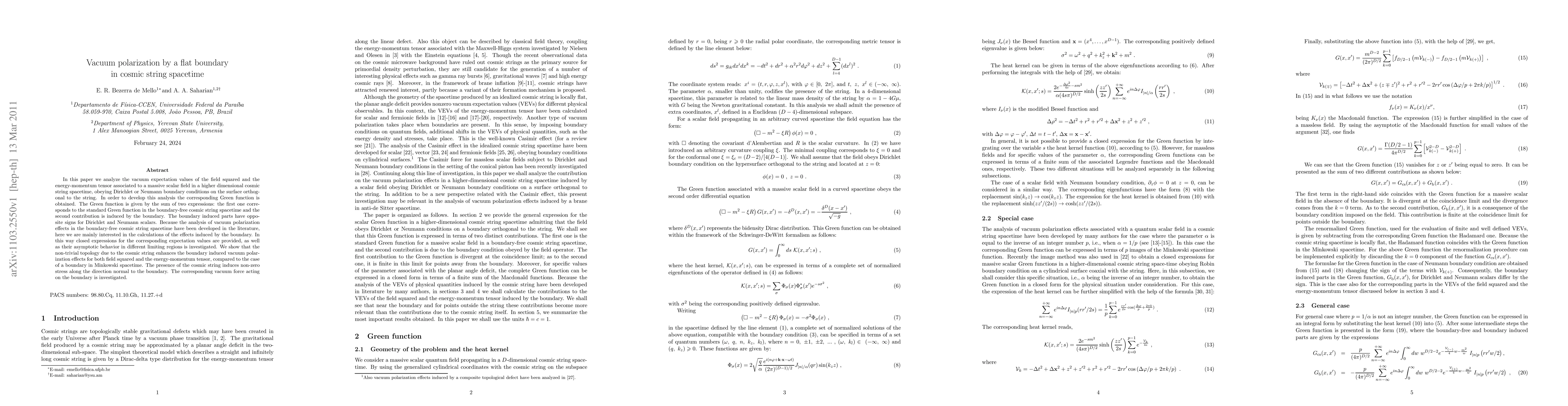 This paper investigates vacuum polarization effects for a massive scalar field in cosmic string spacetime with a flat boundary, focusing on Dirichlet or Neumann conditions. It provides closed expressions for field squared and energy-momentum tensor expectation values and shows that cosmic string topology enhances boundary-induced effects compared to Minkowski spacetime, leading to a non-zero vacuum force on the boundary.