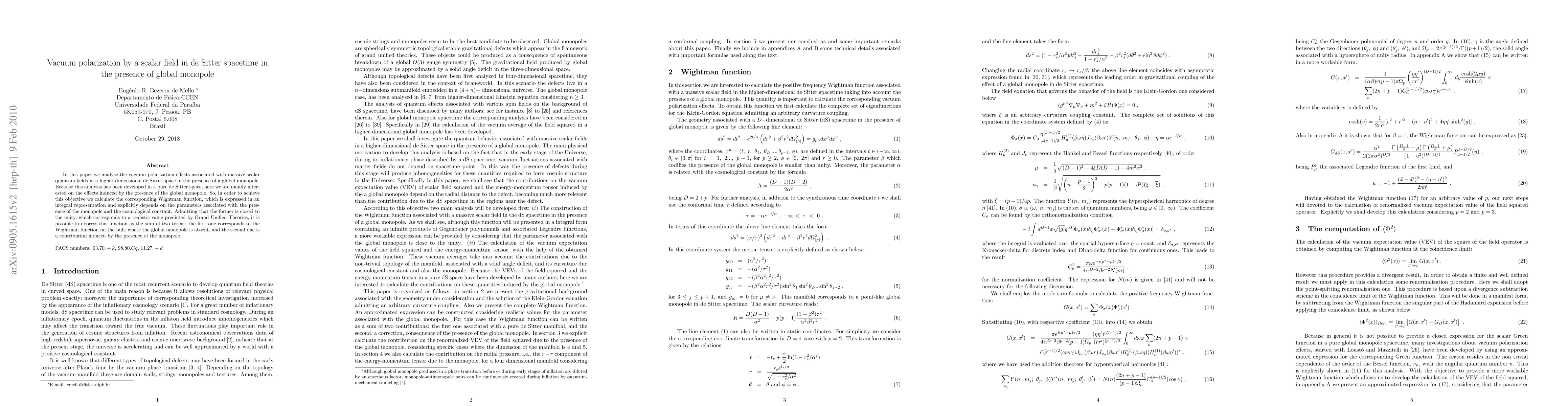 In this paper we analyse the vacuum polarization effects associated with massive scalar quantum fields in a higher-dimensional de Sitter space in the presence of a global monopole. Because this analysis has been developed in a pure de Sitter space, here we are mainly interested on the effects induced by the presence of the global monopole. So, in order to achieve this objective we calculate the corresponding Wightman function, which is expressed in an integral representation and explicitly depends on the parameters associated with the presence of the monopole and the cosmological constant. Admitting that the former is closed to the unity, which corresponds to a realistic value predicted by Grand Unified Theories, it is possible to express this function as the sum of two terms: the first one corresponds to the Wightman function on the bulk where the global monopole is absent, and the second one is a contribution induced by the presence of the monopole.