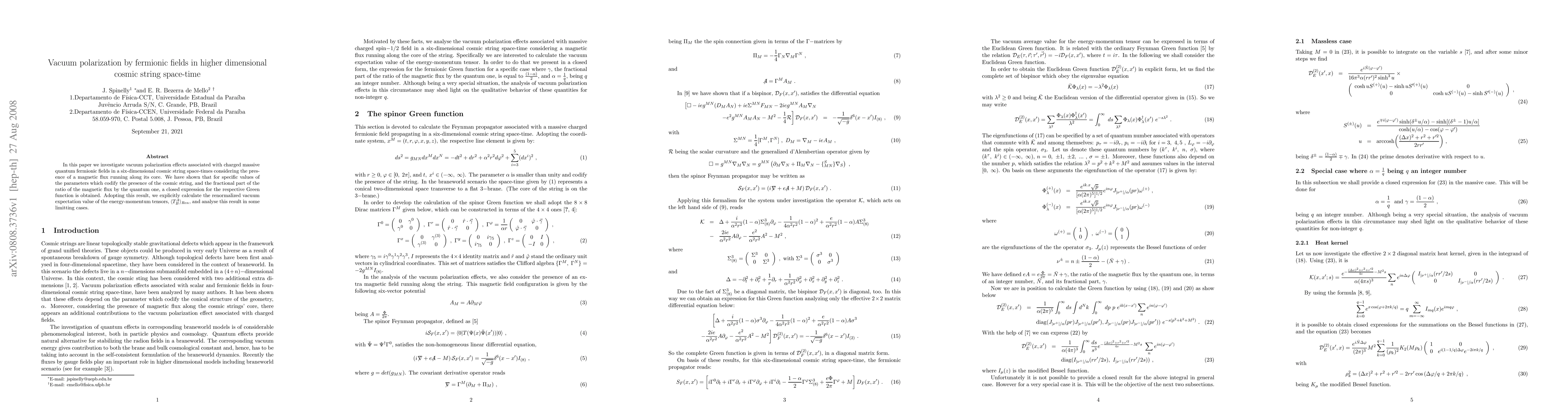 This paper examines vacuum polarization in six-dimensional cosmic string space-time with fermionic fields and magnetic flux. It derives a closed expression for the Green function under specific parameter conditions and calculates the renormalized vacuum energy-momentum tensor, analyzing its implications in limiting cases.