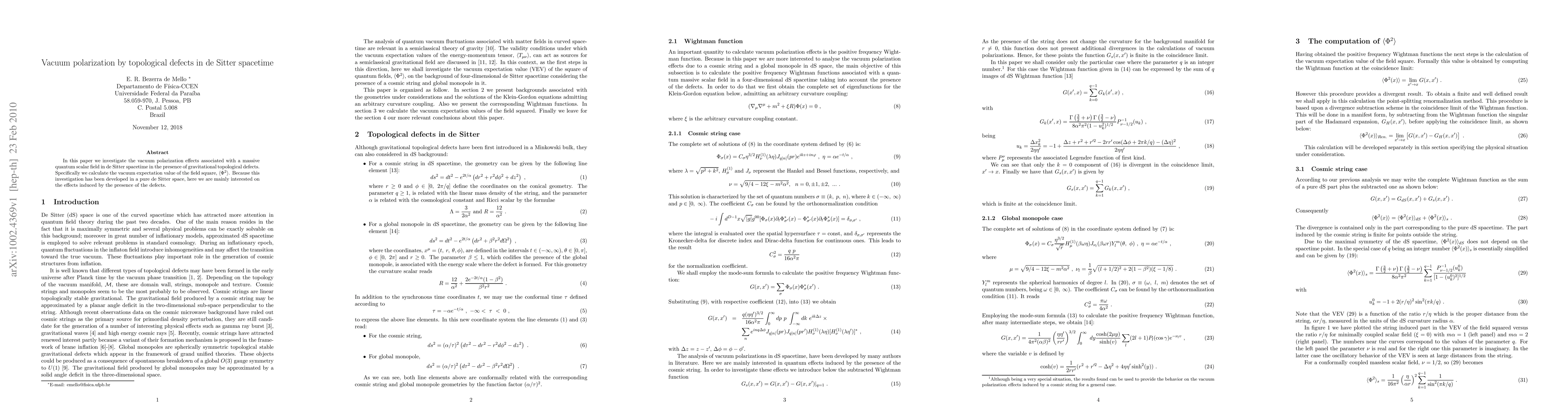 This paper examines vacuum polarization effects in de Sitter spacetime due to gravitational topological defects, focusing on the vacuum expectation value of a massive scalar field's square, $<\Phi^2>$, highlighting the influence of these defects on the quantum field's behavior.