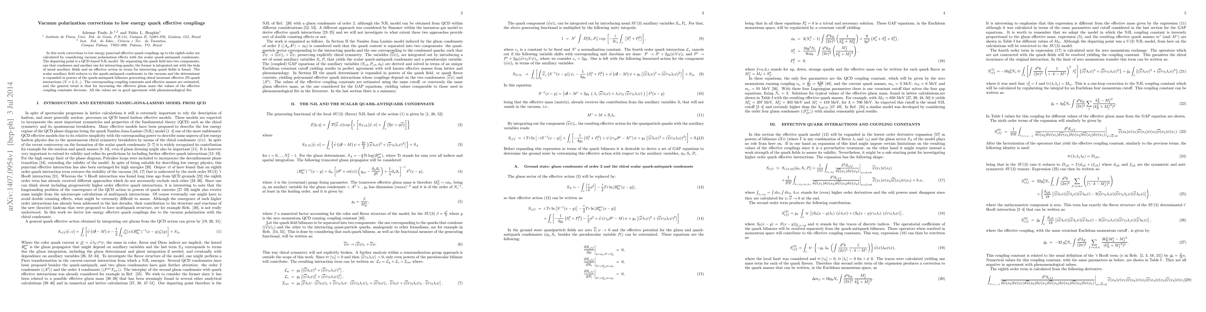 In this work corrections to low energy punctual effective quark couplings up to the eighth order are calculated by considering vacuum polarization effects with the scalar quark-antiquark condensate. The departing point is a QCD-based NJL model. By separating the quark field into two components, one that condenses and another one for interacting quarks, the former is integrated out with the help of usual auxiliary fields and an effective action in terms for interacting quark fields is found. The scalar auxiliary field reduces to the quark-antiquark condensate in the vacuum and the determinant is expanded in powers of the quark-antiquark bilinears generating chiral invariant effective 2N-quark interactions (N=2, 3...). The corresponding coupling constants and effective masses are estimated, and the general trend is that for increasing the effective gluon mass the values of the effective coupling constants decrease. All the values are in good agreement with phenomenological fits.