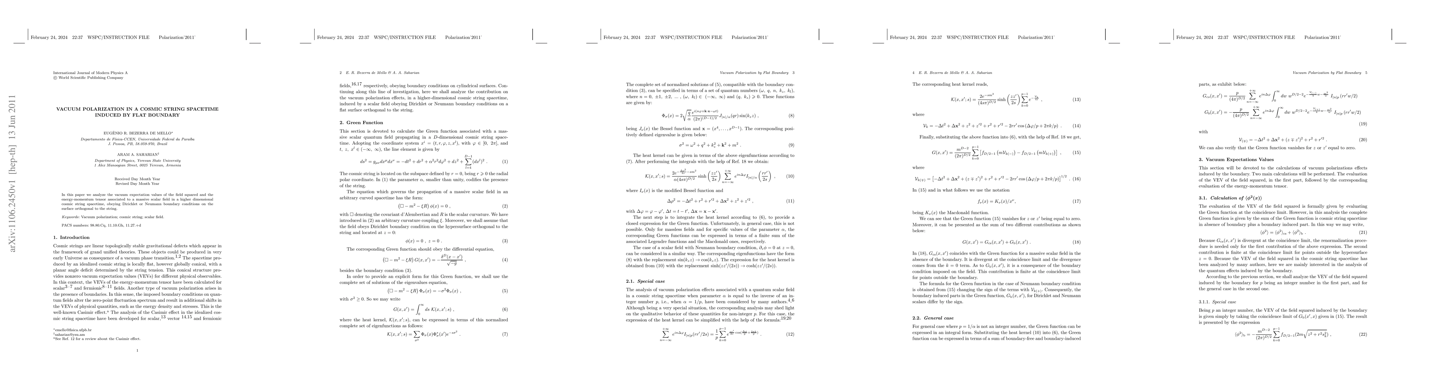 This paper investigates vacuum polarization effects, specifically the vacuum expectation values of a massive scalar field's squared field and energy-momentum tensor, in a higher-dimensional cosmic string spacetime influenced by flat boundary conditions, following either Dirichlet or Neumann conditions.