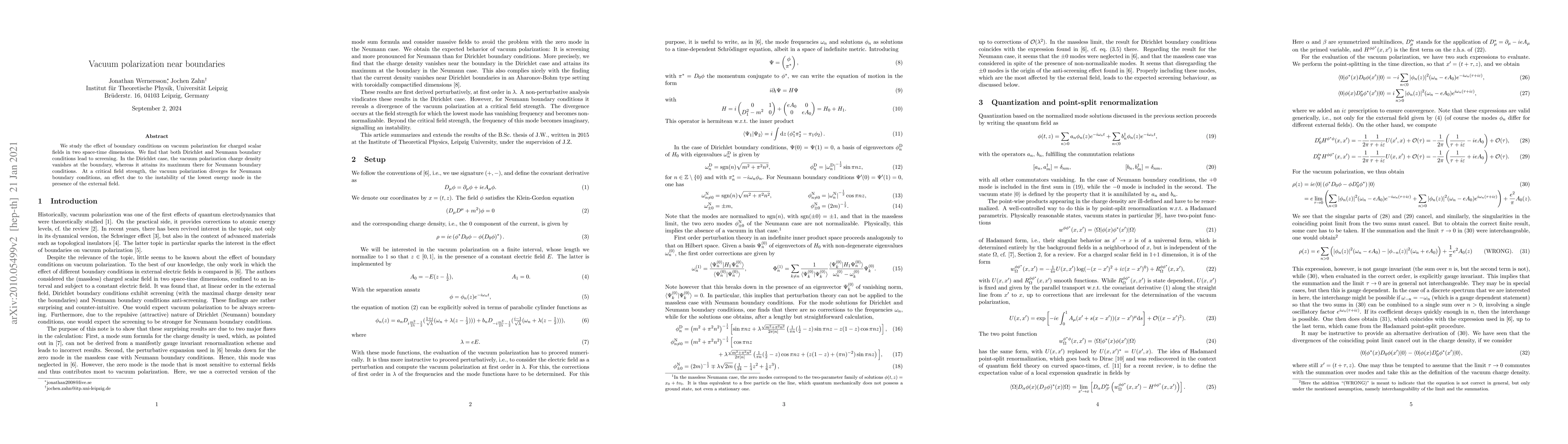 This paper investigates vacuum polarization for charged scalar fields in two dimensions under Dirichlet and Neumann boundary conditions, revealing that both conditions lead to screening effects. For Dirichlet, the charge density vanishes at the boundary, while for Neumann, it peaks there, with a divergence in polarization at a critical field strength due to the instability of the lowest energy mode.