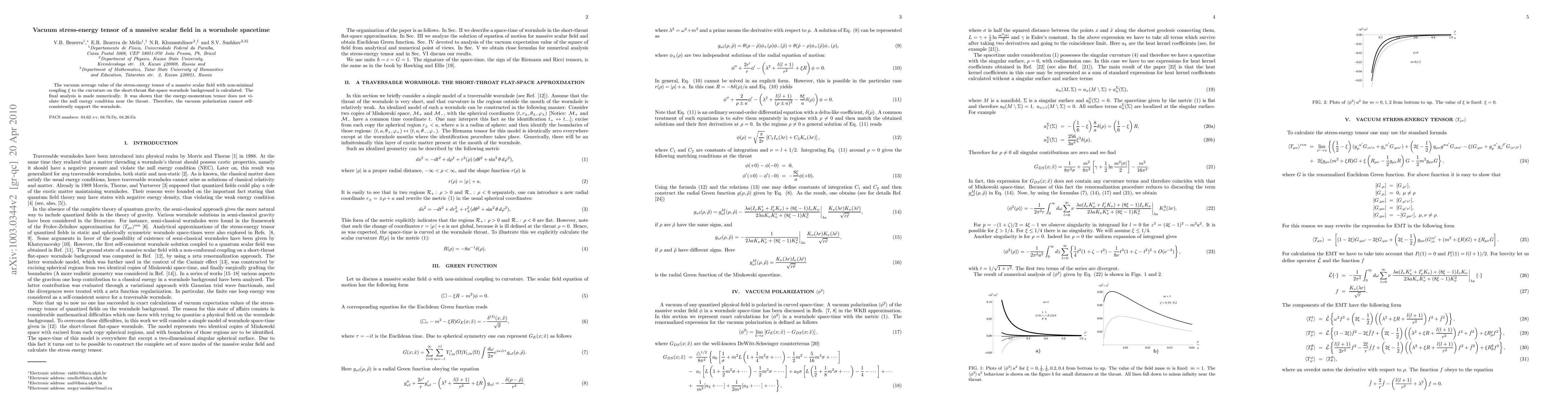 This paper numerically investigates the vacuum polarization of a massive scalar field in a wormhole spacetime, showing it cannot self-consistently support the wormhole, although the energy-momentum tensor satisfies the null energy condition near the throat. Analytical solutions are infeasible, necessitating a numerical analysis for various coupling constants.