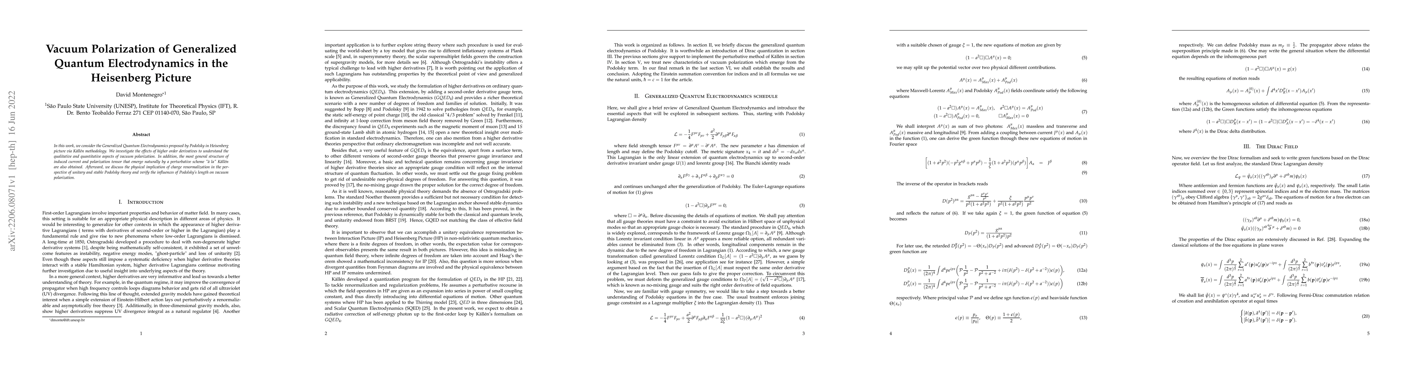 This paper explores generalized quantum electrodynamics in the Heisenberg picture, focusing on vacuum polarization effects induced by higher-order derivatives. It derives the most general structure of induced current and polarization tensor using a perturbative Kallen scheme and discusses the implications of charge renormalization for the theory's unitarity and stability.