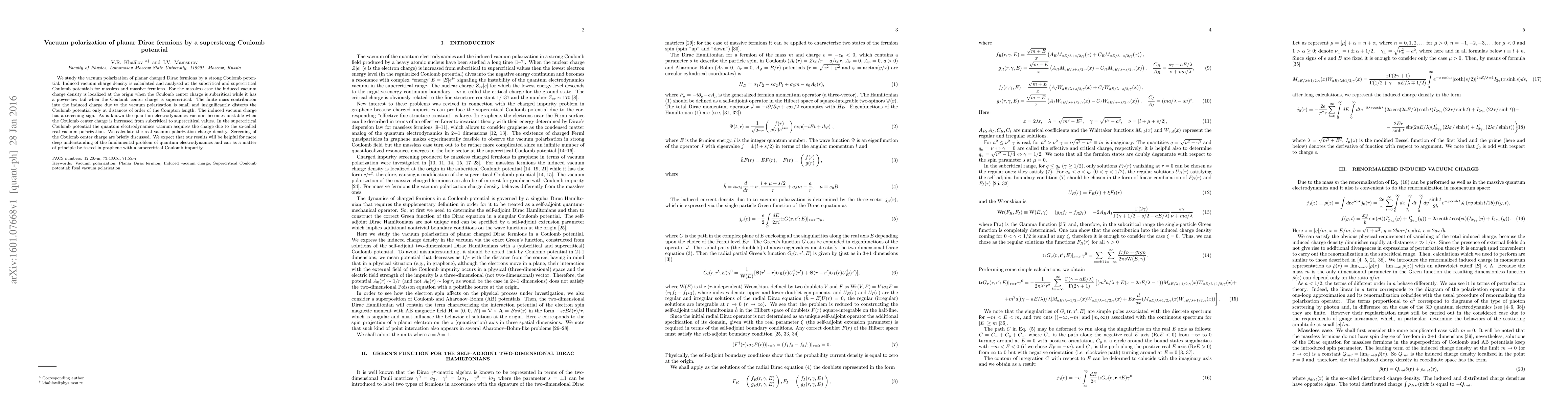 This paper investigates the vacuum polarization of planar Dirac fermions under a strong Coulomb potential, finding that the induced vacuum charge density exhibits different behaviors depending on whether the potential is subcritical or supercritical. The results suggest that the vacuum becomes unstable and acquires charge in supercritical conditions, with implications for understanding quantum electrodynamics and potential experimental verification in graphene.