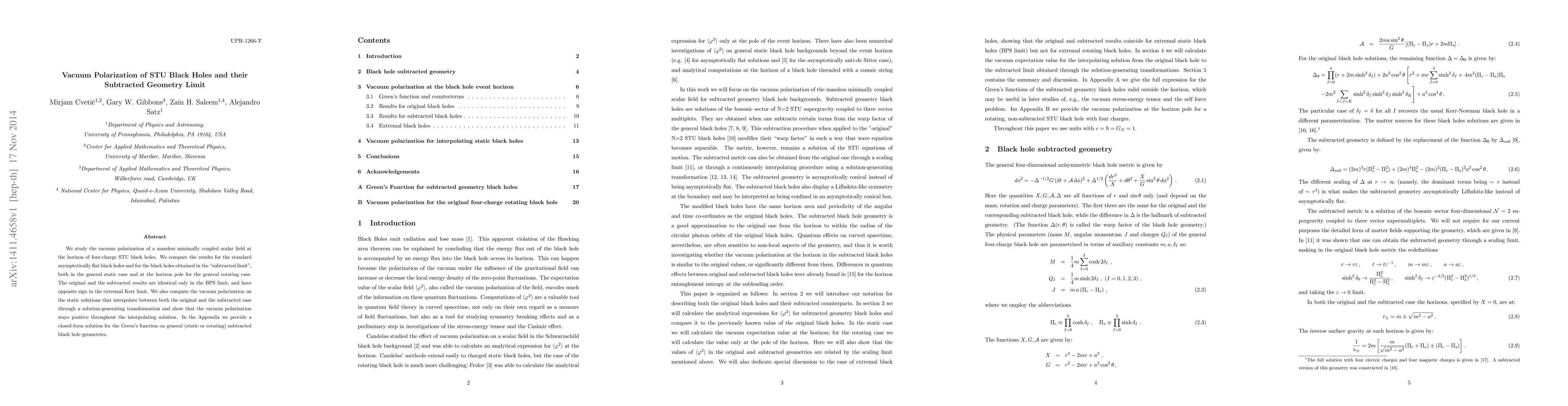 We study the vacuum polarization of a massless minimally coupled scalar field at the horizon of four-charge STU black holes. We compare the results for the standard asymptotically flat black holes and for the black holes obtained in the "subtracted limit", both in the general static case and at the horizon pole for the general rotating case. The original and the subtracted results are identical only in the BPS limit, and have opposite sign in the extremal Kerr limit. We also compute the vacuum polarization on the static solutions that interpolate between both the original and the subtracted case through a solution-generating transformation and show that the vacuum polarization stays positive throughout the interpolating solution. In the Appendix we provide a closed-form solution for the Green's function on general (static or rotating) subtracted black hole geometries.