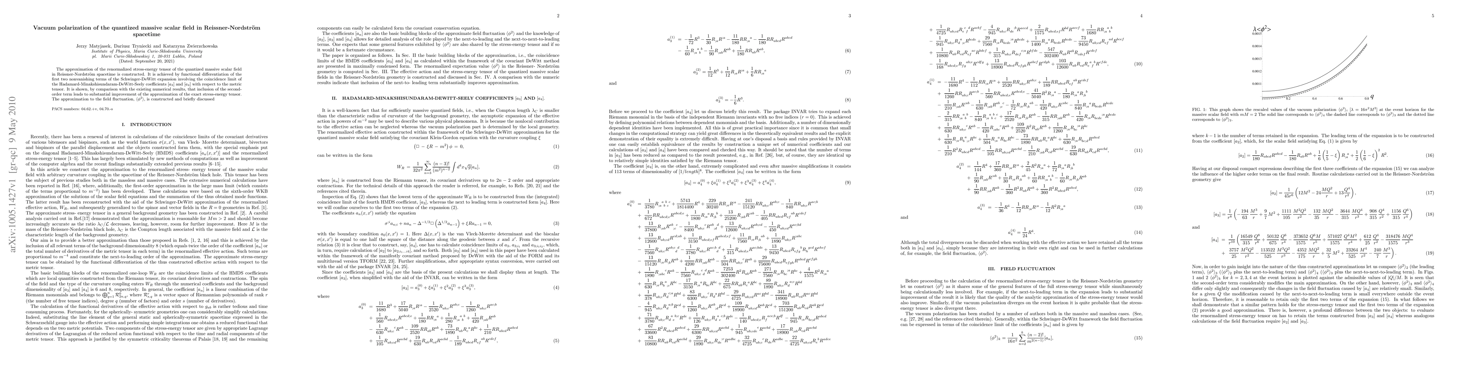 The approximation of the renormalized stress-energy tensor of the quantized massive scalar field in Reissner-Nordstr\"om spacetime is constructed. It is achieved by functional differentiation of the first two nonvanishing terms of the Schwinger-DeWitt expansion involving the coincidence limit of the Hadamard-Minakshisundaram-DeWitt-Seely coefficients $[a_{3}]$ and $[a_{4}]$ with respect to the metric tensor. It is shown, by comparison with the existing numerical results, that inclusion of the second-order term leads to substantial improvement of the approximation of the exact stress-energy tensor. The approximation to the field fluctuation, $\langle \phi^{2} \rangle,$ is constructed and briefly discussed.