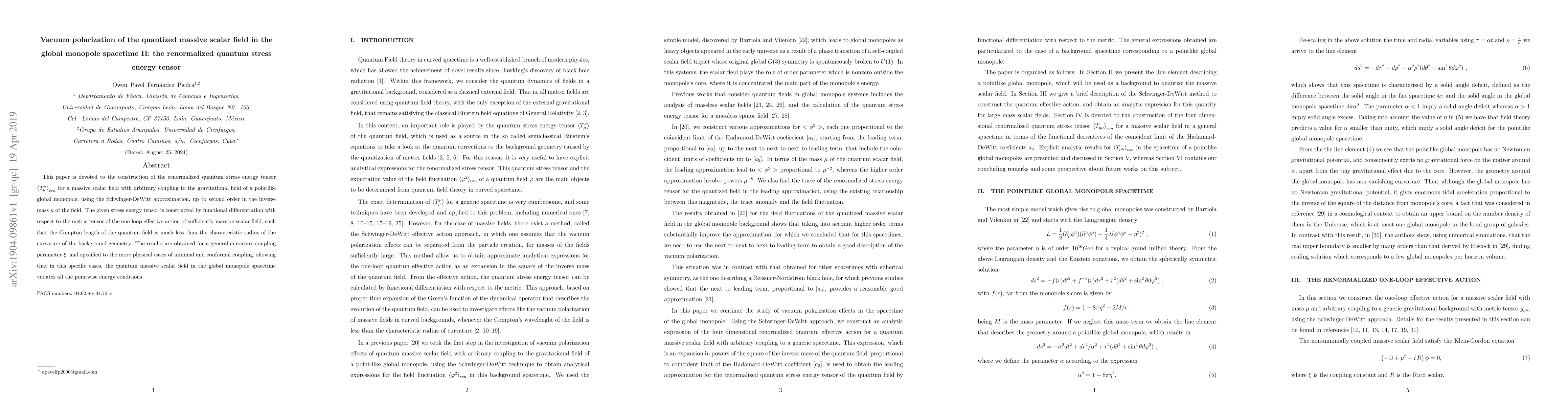 This paper constructs the renormalized quantum stress-energy tensor for a massive scalar field in a global monopole spacetime, revealing violations of pointwise energy conditions for minimal and conformal coupling. The tensor is derived using the Schwinger-DeWitt approximation up to second order in the inverse mass.